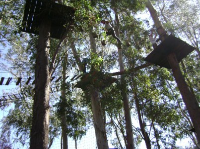 Depois fomos até a parte de cima da fazenda. No local há um circuito de arvorismo organizado e com plataformas altas. Pagamos R$30 por pessoa.