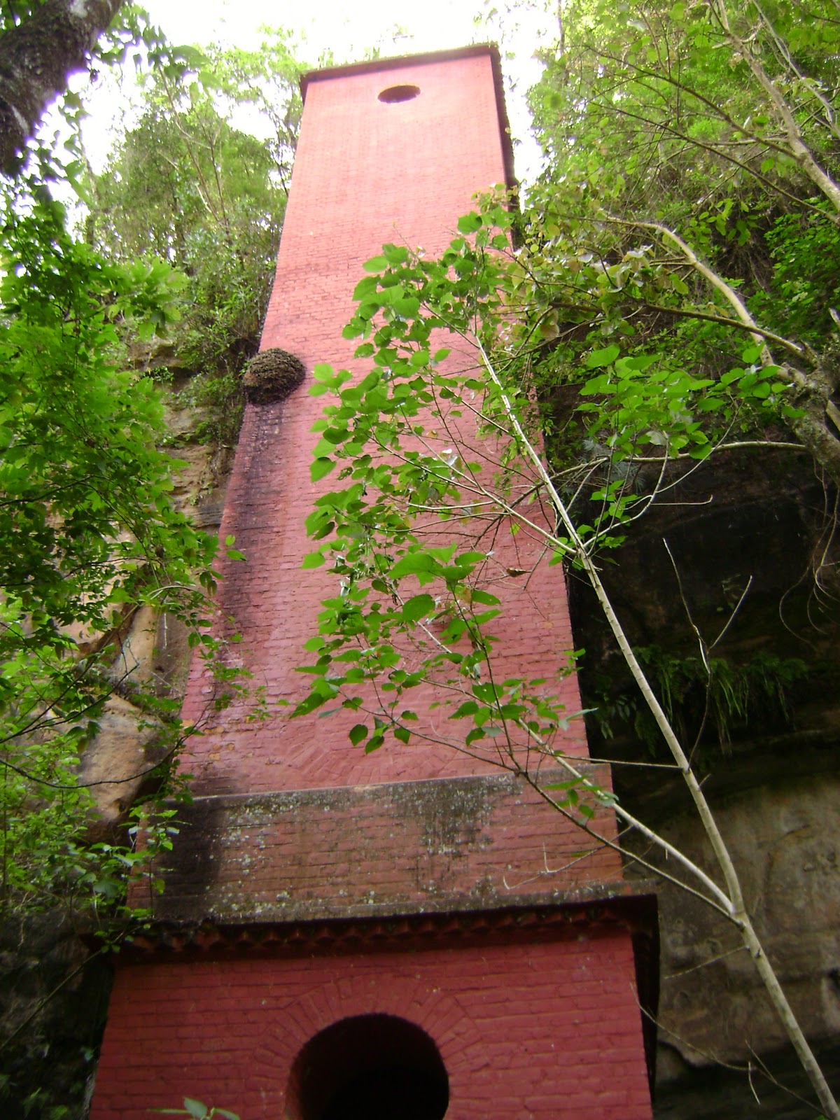 Chegamos próximo da hora do almoço à cidadezinha de Ibaiti, e vimos uma feira de rua. Lá mesmo almoçamos alguns pastéis e com algumas informações chegamos ao Parque Estadual da Mina Velha. Esse parque é diferente da maioria dos outros. Ele fica dentro da cidade, e parece mais um jardim, cheio de caminhos cimentados e escadas em meio às árvores. É bem legal. Como o próprio nome sugere, o local é uma mina de carvão desativada. A entrada é gratuita, e não precisa de guia, pois os caminhos são bem óbvios. É possível ver alguns fornos, chaminés e construções antigas. Mas o mais interessante mesmo é a cachoeira que passa sobre o túnel da mina.