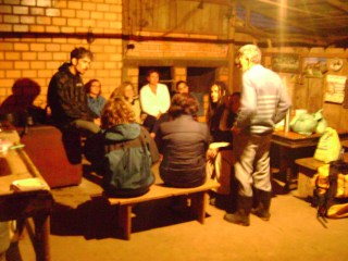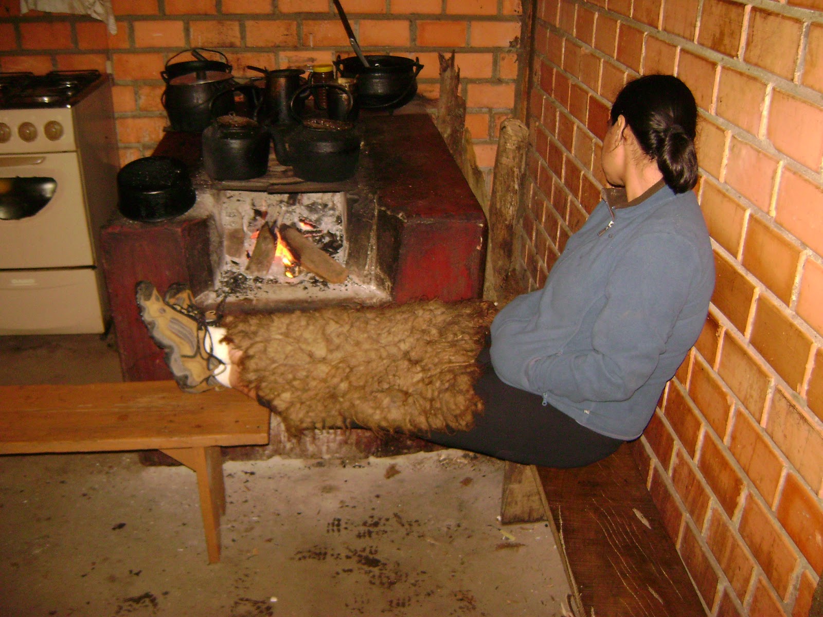 Montamos as barracas, e como estava muito frio (estou falando de novo porque estava mesmo!) ficamos na cozinha ao lado do fogão à lenha conversando até tarde. Jantamos, e eu nem sei como consegui tomar banho (Obs: O chuveiro era frio). Conversamos bastante com as gurias de Curitiba, que estavam fazendo uma trilha longa lá no Guartelá, e também trocamos boas risadas com um pessoal que estava hospedado em Castro que apareceu lá à noite pra curtir o fogão à lenha. O senhor, dono do sítio também ficou conosco na cozinha, tomando chimarrão e contando várias histórias da região antes do parque ser criado. A Michelle achou um tapete de lã de carneiro e usou para cobrir as pernas.