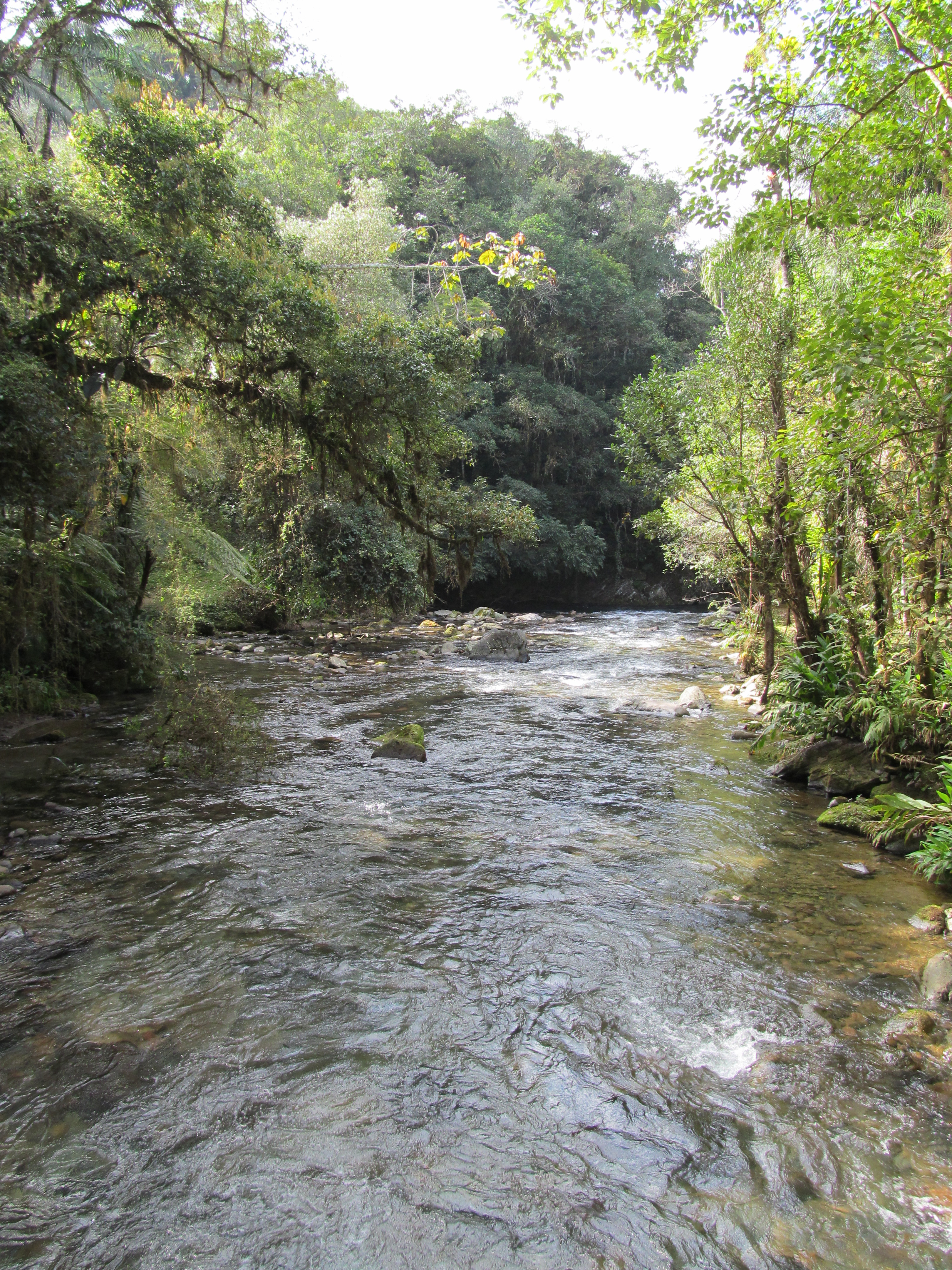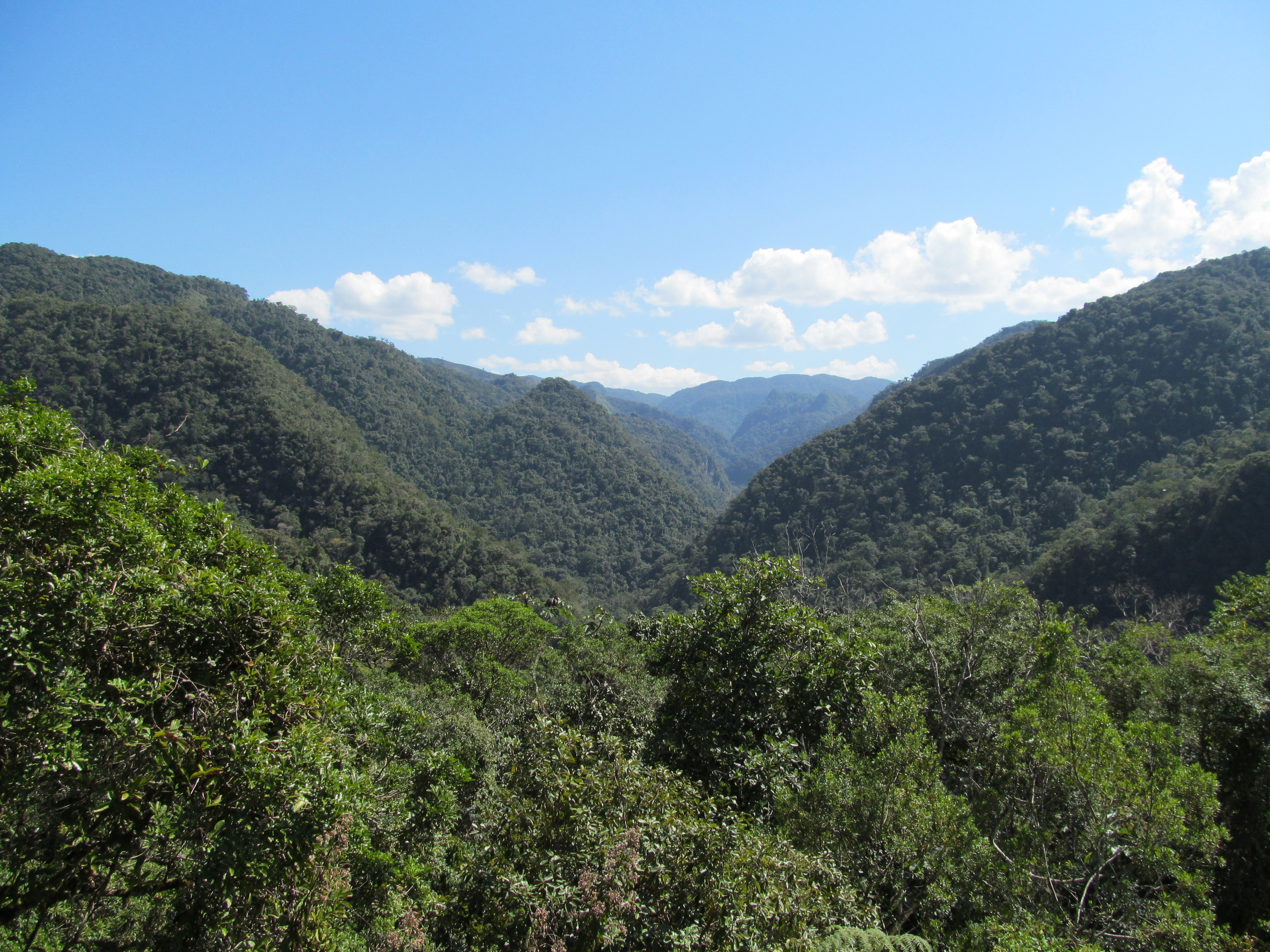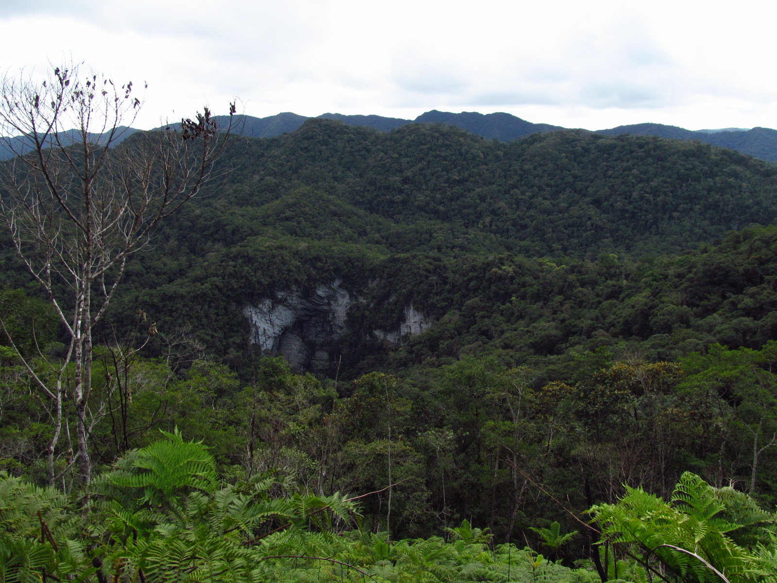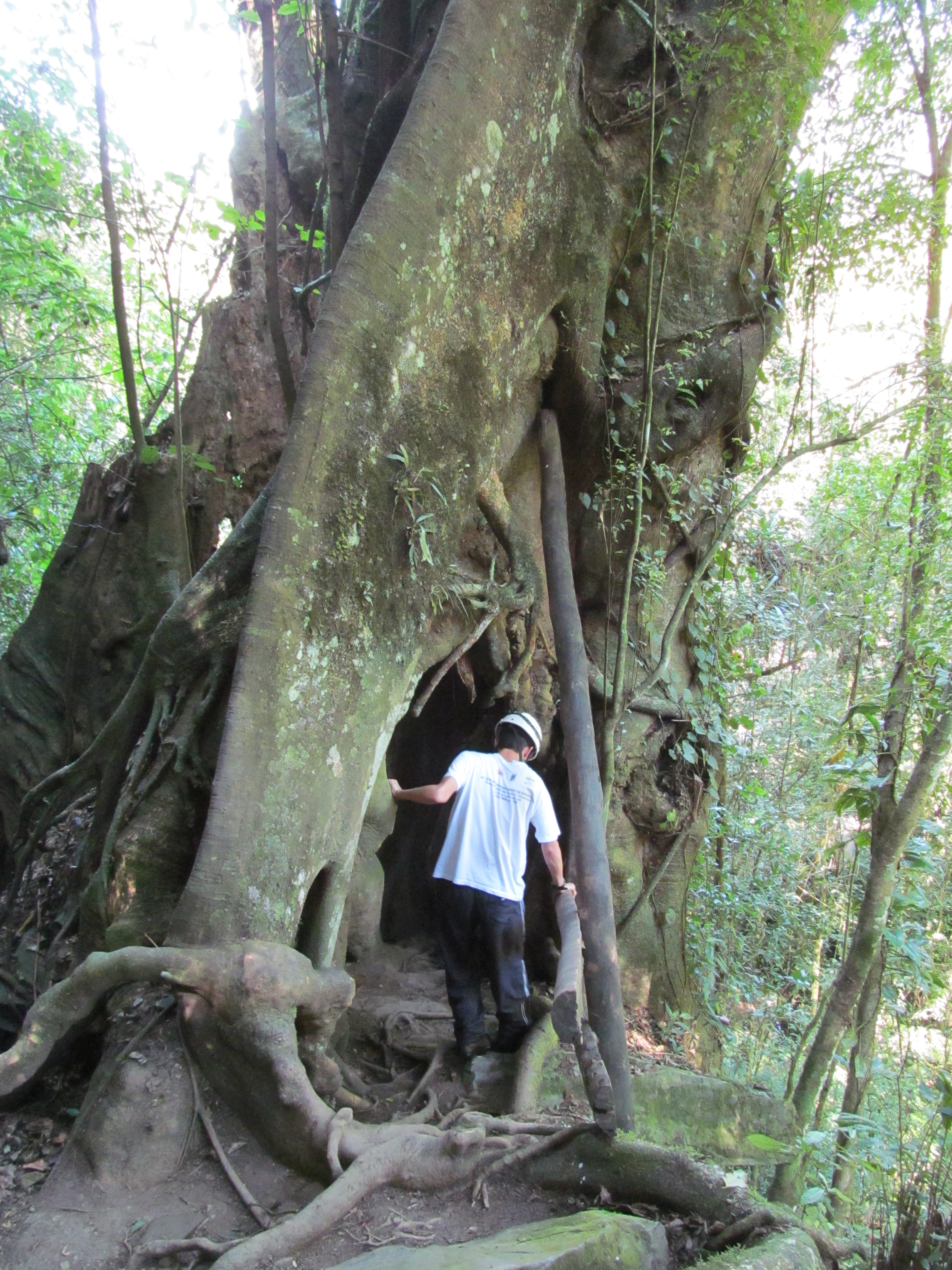 Voltamos pro camping, almoçamos e combinamos de ir com o Adriano e o amigo conhecer uma caverna que não é aberta a turistas, a Caverna da Laje Branca. O Dema nos deixou em uma estradinha de terra e fomos nós quatro rumo à caverna. percorremos alguns quilômetros de trilha, e vimos a caverna de longe, incrustada na mata Atlântica.