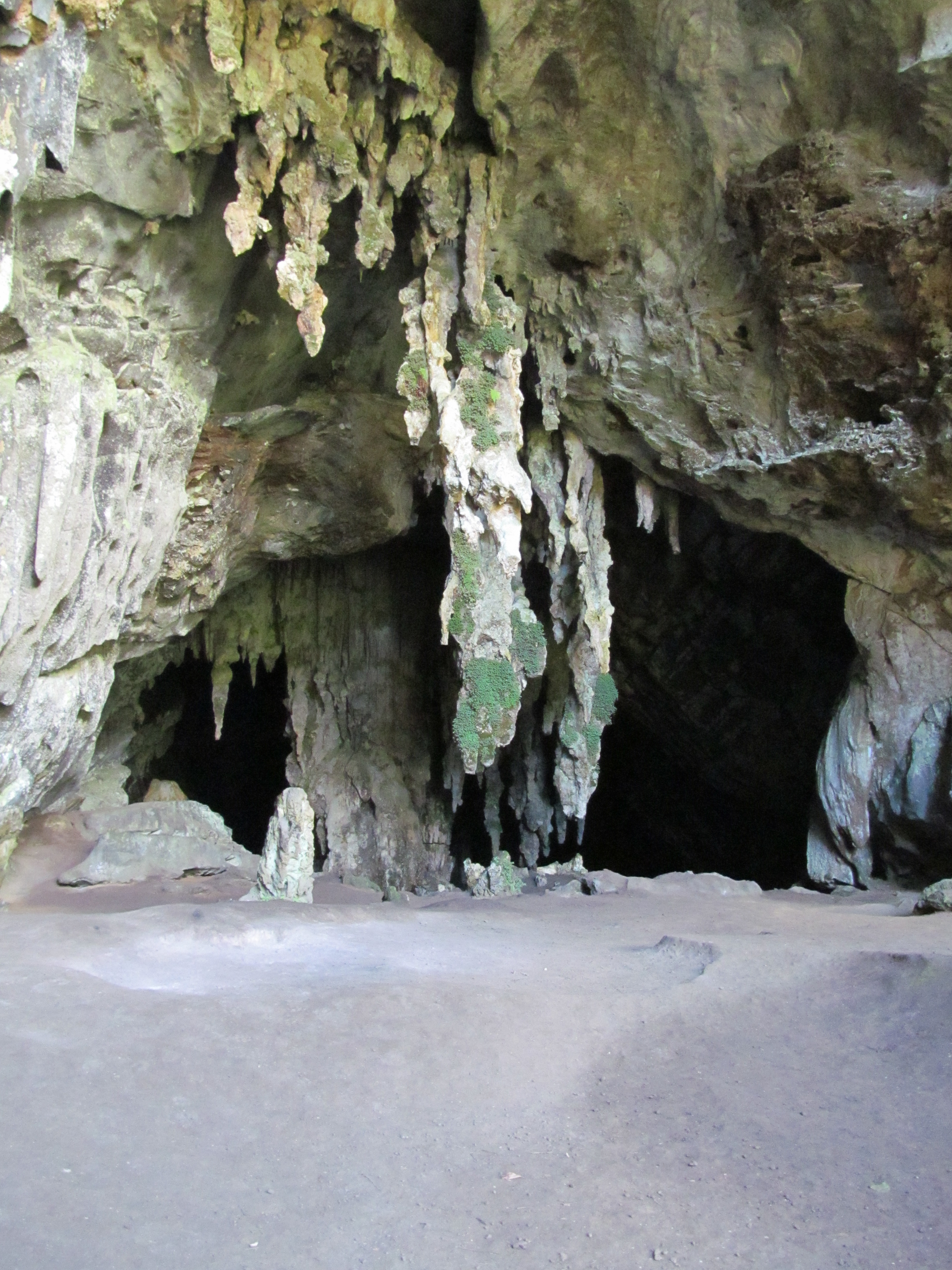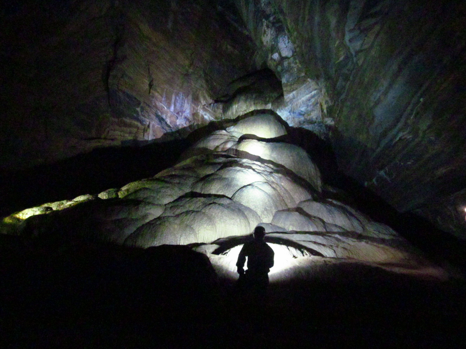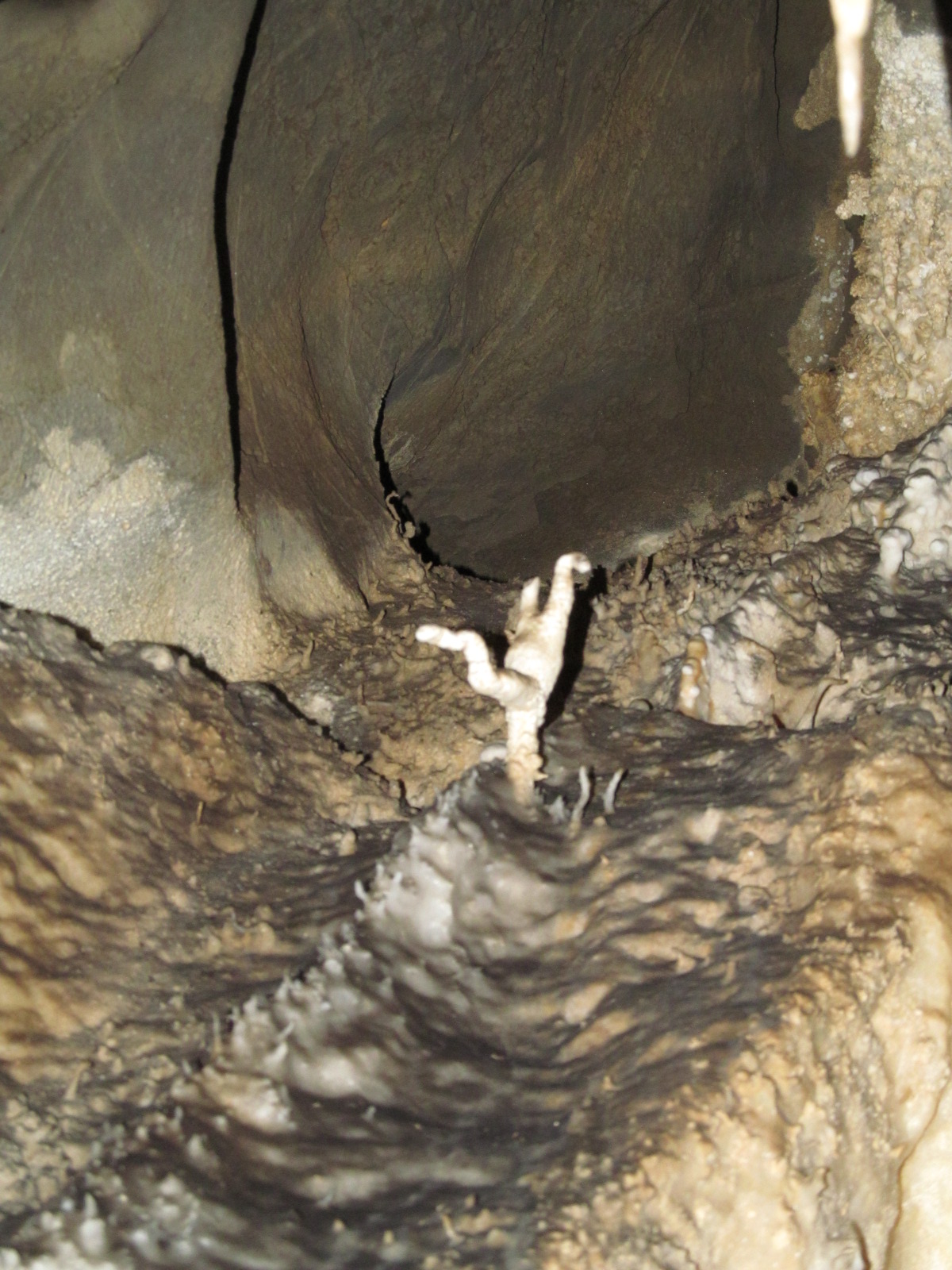 A caverna por dentro é muito grande e alta, cheia de pedras no chão. Andamos cerca de meia hora até chegar onde acaba a caverna. pelo formato dela, dá para ver que o que o Adriano disse faz sentido. Não há bifurcações, e a caverna vai afunilando conforme adentramos. Parece mesmo que uma grande rocha se abriu e a caverna nada mais é do que uma enorme rachadura na rocha. Nessa caverna vimos coisas curiosas também, como uma estalagmite gigante, que lembra um gigantesco bolo de festa e também vimos “pérolas”, umas pedrinhas que se formam com o cálcio contido na água que pinga das estalactites, e com o movimento da água, em milhares de anos as pedras tomam forma ovaladas.