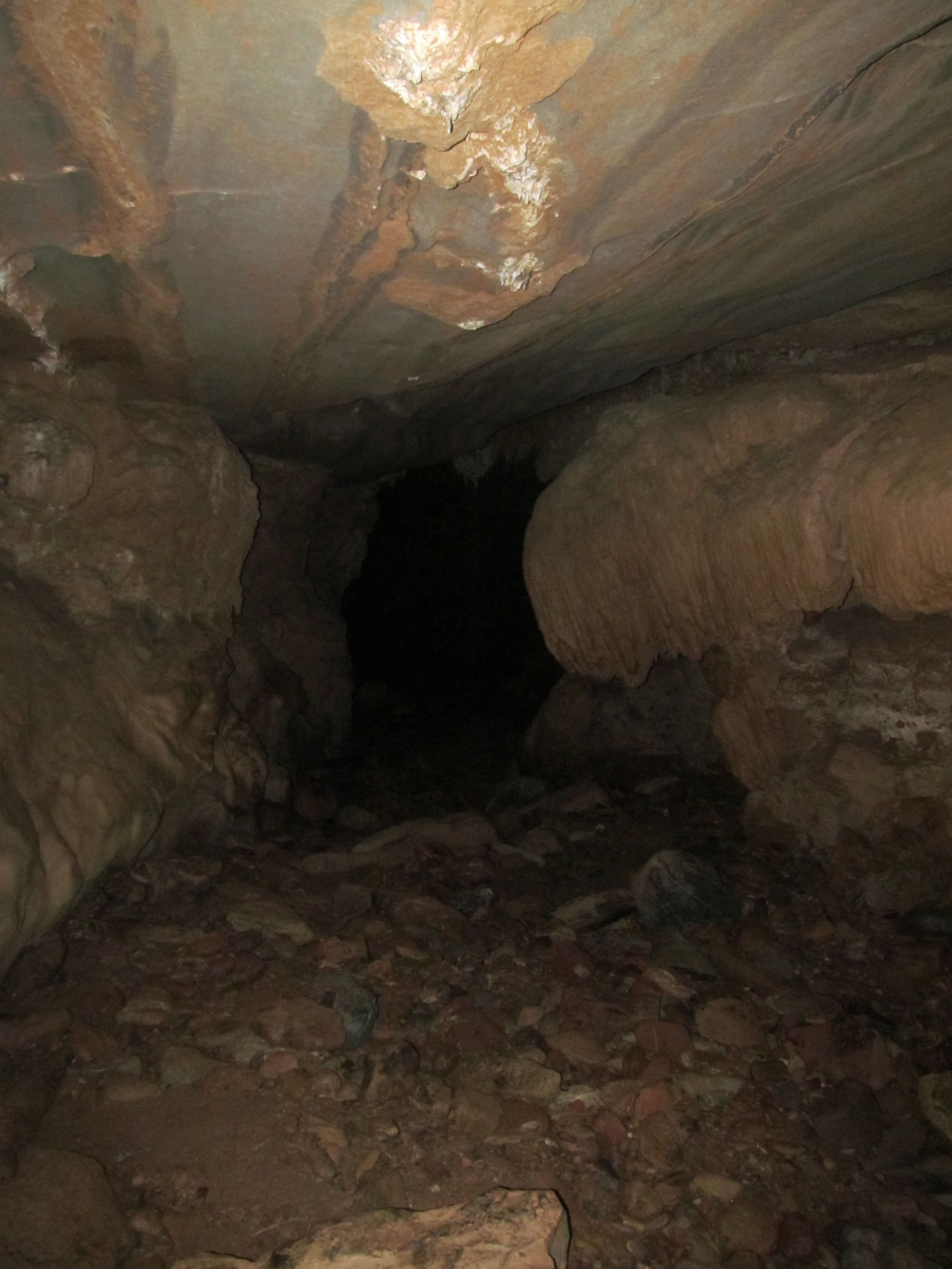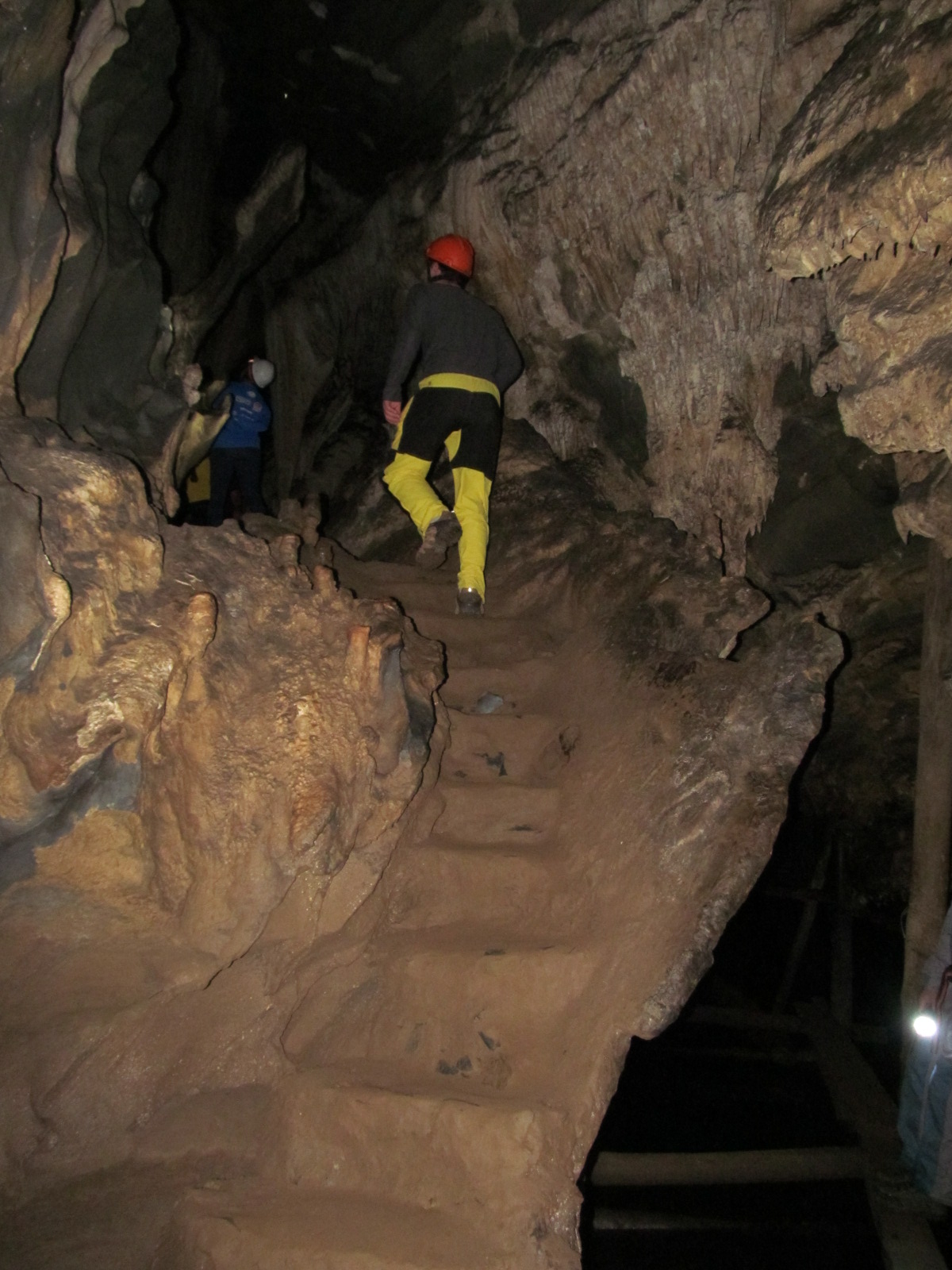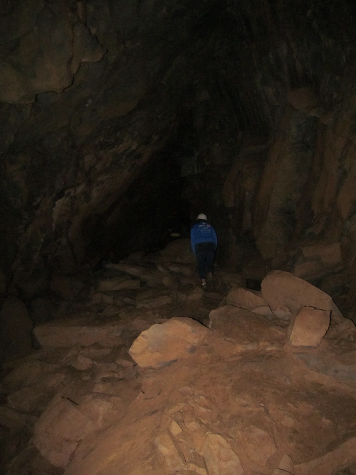 A caverna por dentro é muito grande e alta, cheia de pedras no chão. Andamos cerca de meia hora até chegar onde acaba a caverna. pelo formato dela, dá para ver que o que o Adriano disse faz sentido. Não há bifurcações, e a caverna vai afunilando conforme adentramos. Parece mesmo que uma grande rocha se abriu e a caverna nada mais é do que uma enorme rachadura na rocha. Nessa caverna vimos coisas curiosas também, como uma estalagmite gigante, que lembra um gigantesco bolo de festa e também vimos “pérolas”, umas pedrinhas que se formam com o cálcio contido na água que pinga das estalactites, e com o movimento da água, em milhares de anos as pedras tomam forma ovaladas.