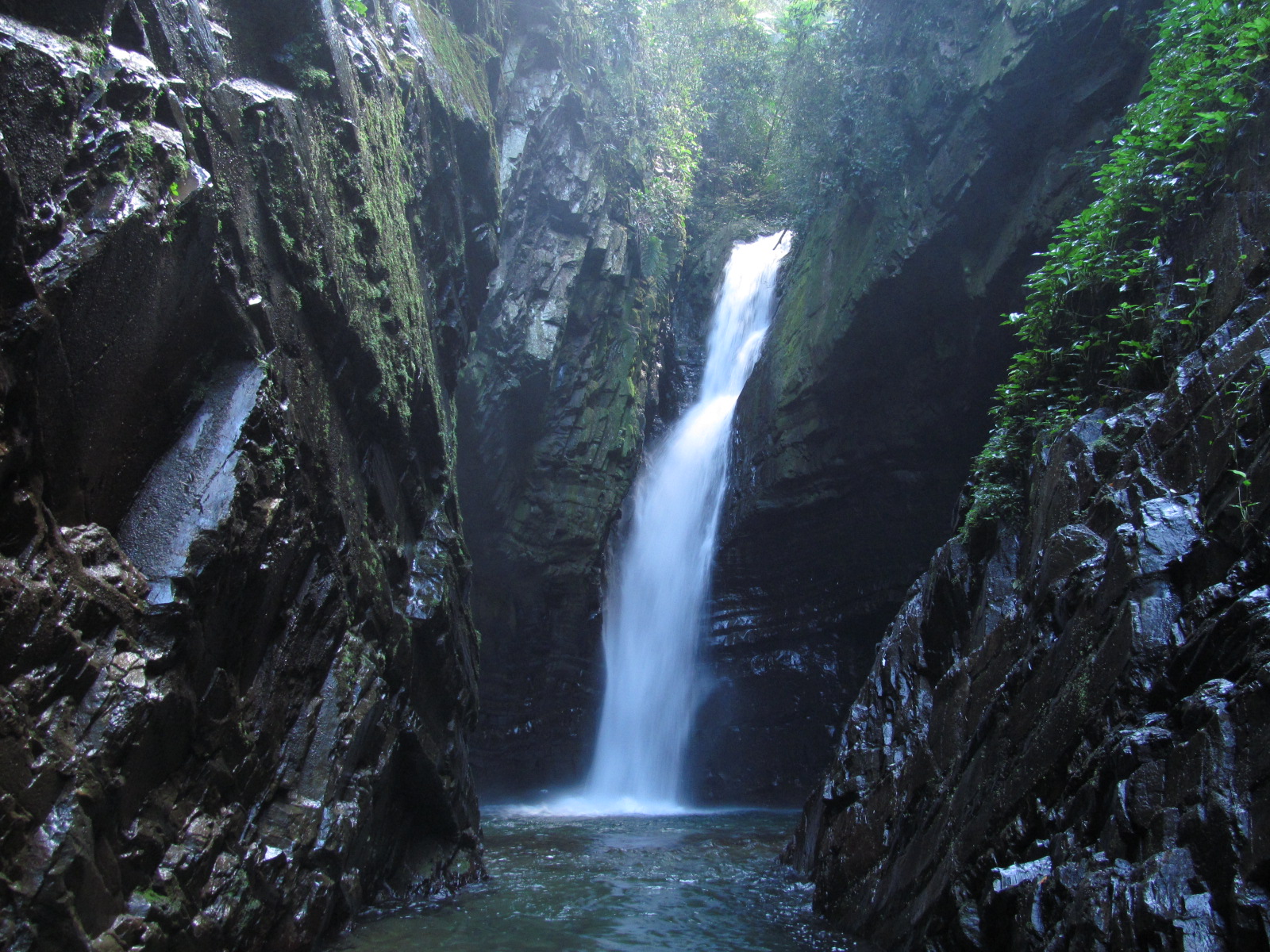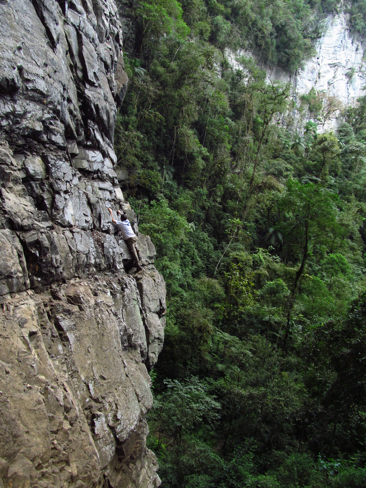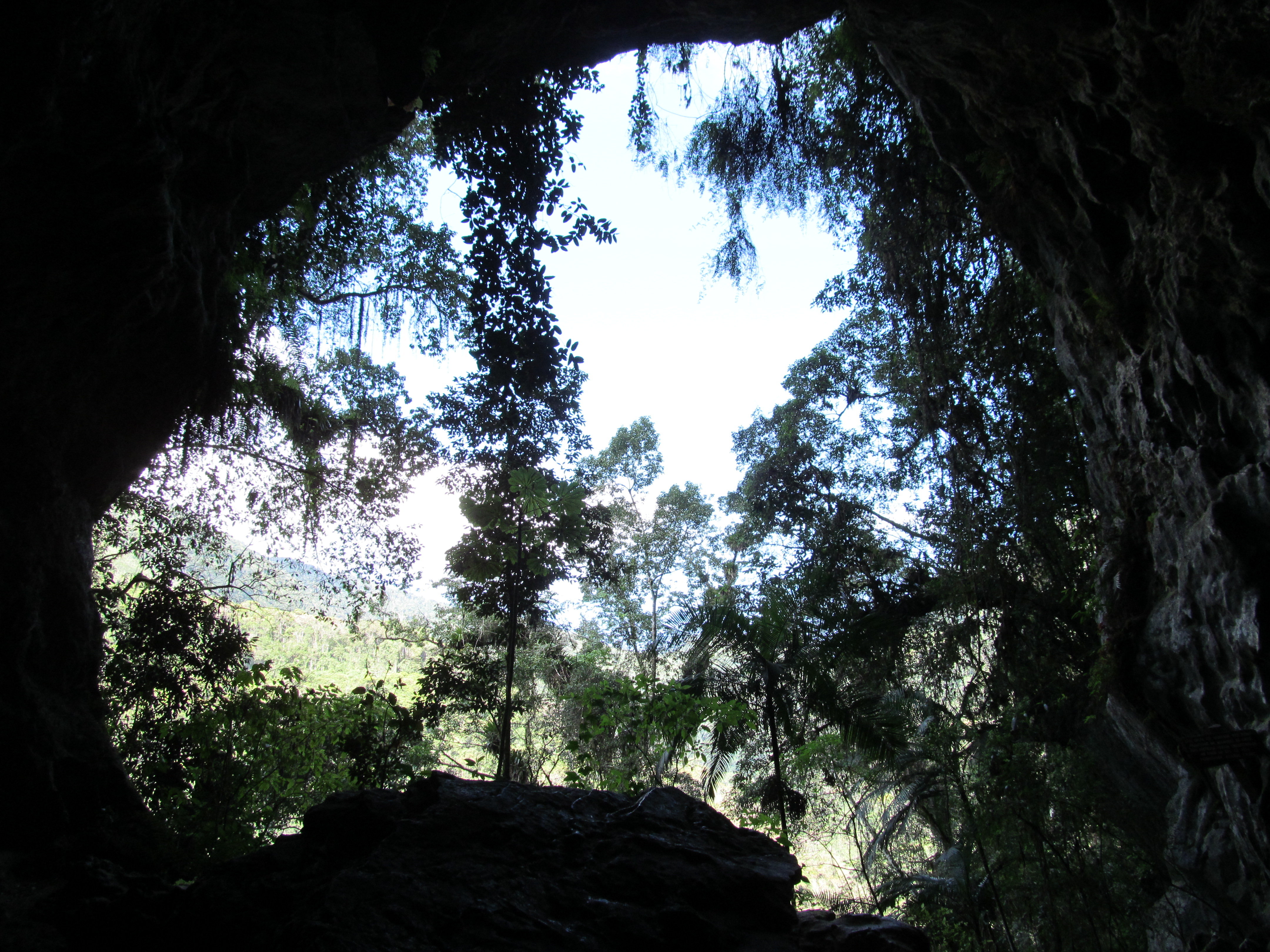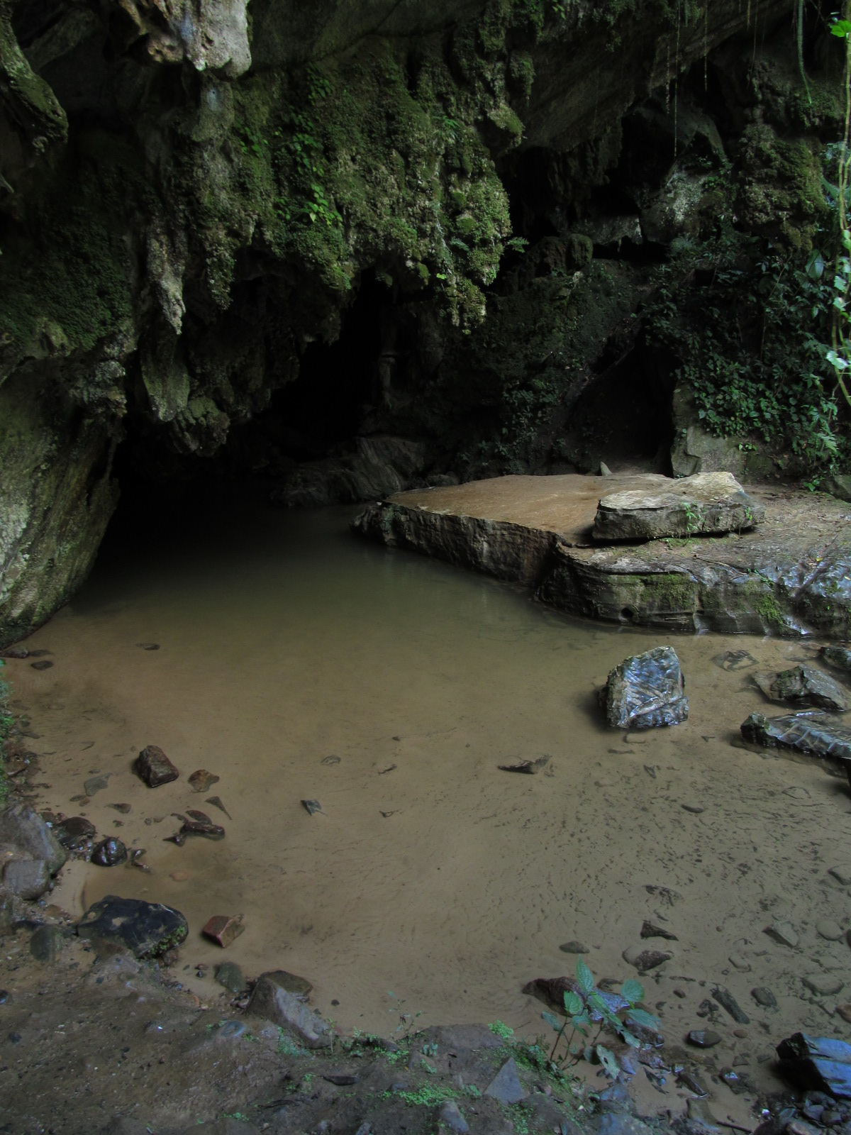 Entramos na mata e fomos percorrendo uma trilha de mais alguns quilômetros, até que chegamos ao pórtico da caverna: Gigantesco, quase não conseguimos ver o topo da pedra. pelo que o Adriano contou, essa caverna, diferentemente das outras da região, foi formada não pelo desgaste do calcário pela água, mas por um tremor de terra que há milhares de anos fez a rocha se deslocar abrindo um vão que resultou na caverna.