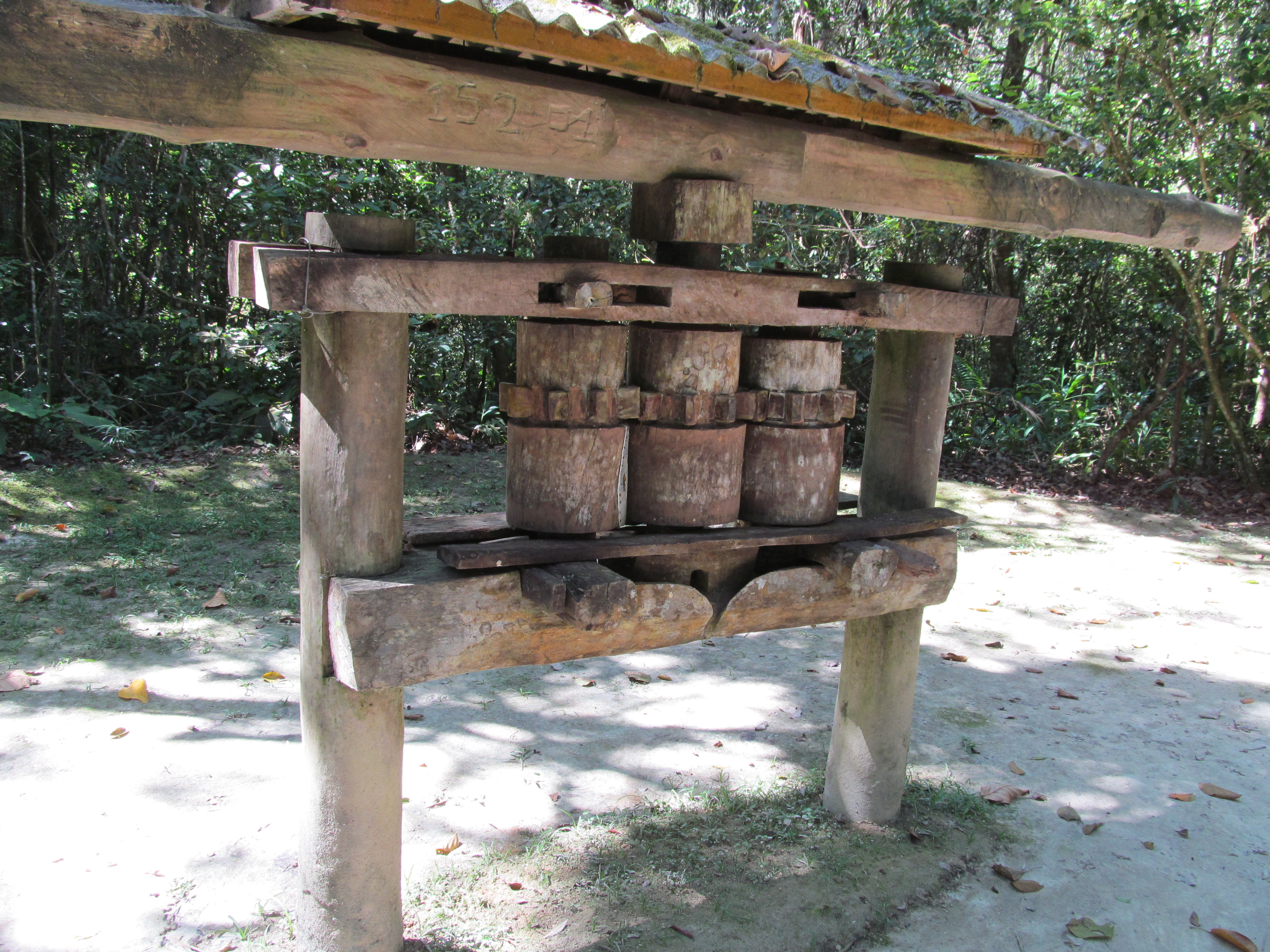 Ainda nesse núcleo, fizemos a Trilha da Figueira, que apesar de curta é bem legal, pois há um ponto que a trilha passa por dentro de uma árvore. Também vimos a Casa da Farinha, tipo um pequeno museu feito de taipa com utensílios usados para a produção da farinha de mandioca, produto feito pelos quilombolas da região.