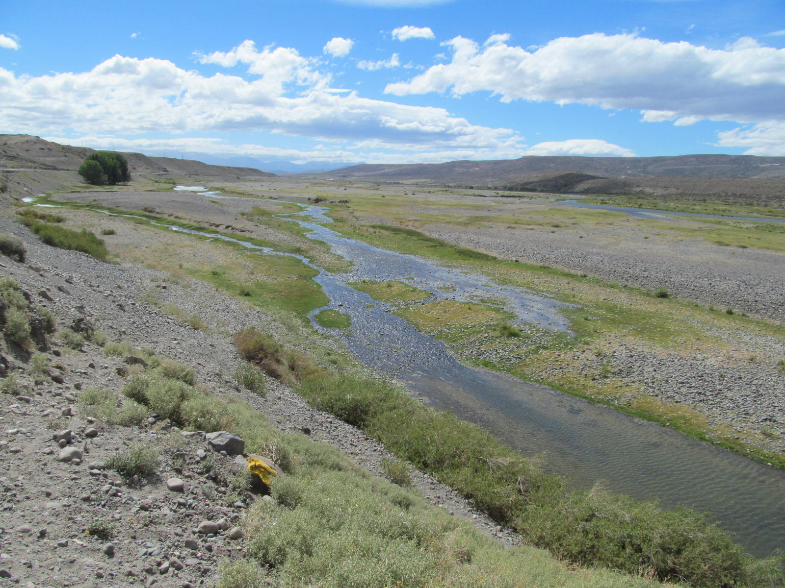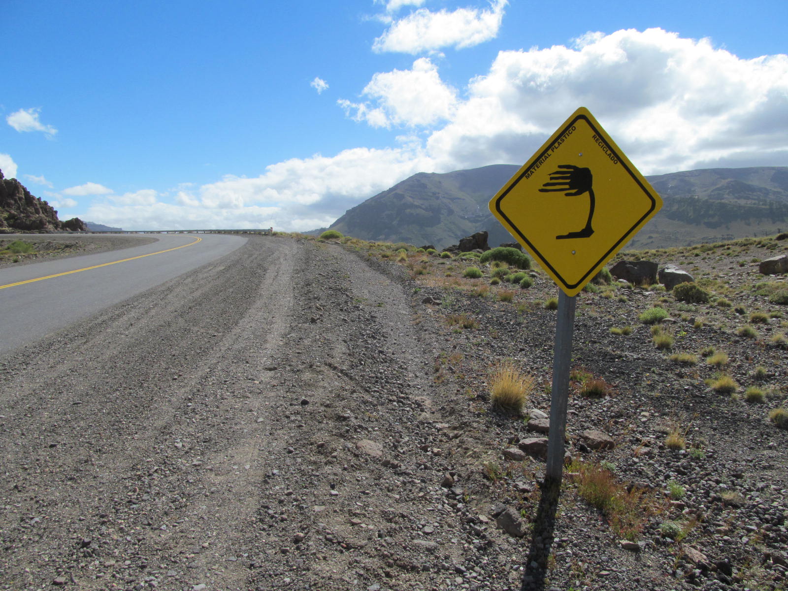 De volta à estrada, continuamos na Ruta 152, com suas retas intermináveis, e cada vez mais seco, fomos até General Roca e pegamos a Ruta 22 até a cidadezinha de Zapala. Passamos por Néuquen e Plottier, em um vale de um rio, bem irrigado, com várias plantações de frutas (especialmente maçãs). De Zapala fomos até Las Lajas, uma cidadezinha que venta absurdamente. Dessa cidade já é possível avistar a Cordilheira dos Andes. Nessa região começam a aparecer alguns riachos e lagos provenientes do degelo das montanhas. Andamos mais um tempo e começamos a subir a cordilheira. A estrada é boa e bem sinalizada, mas o vento é tanto que chega a balançar o carro. Em um momento paramos para tirar fotos, e foi até difícil de abrir a porta para sair do Uninho !