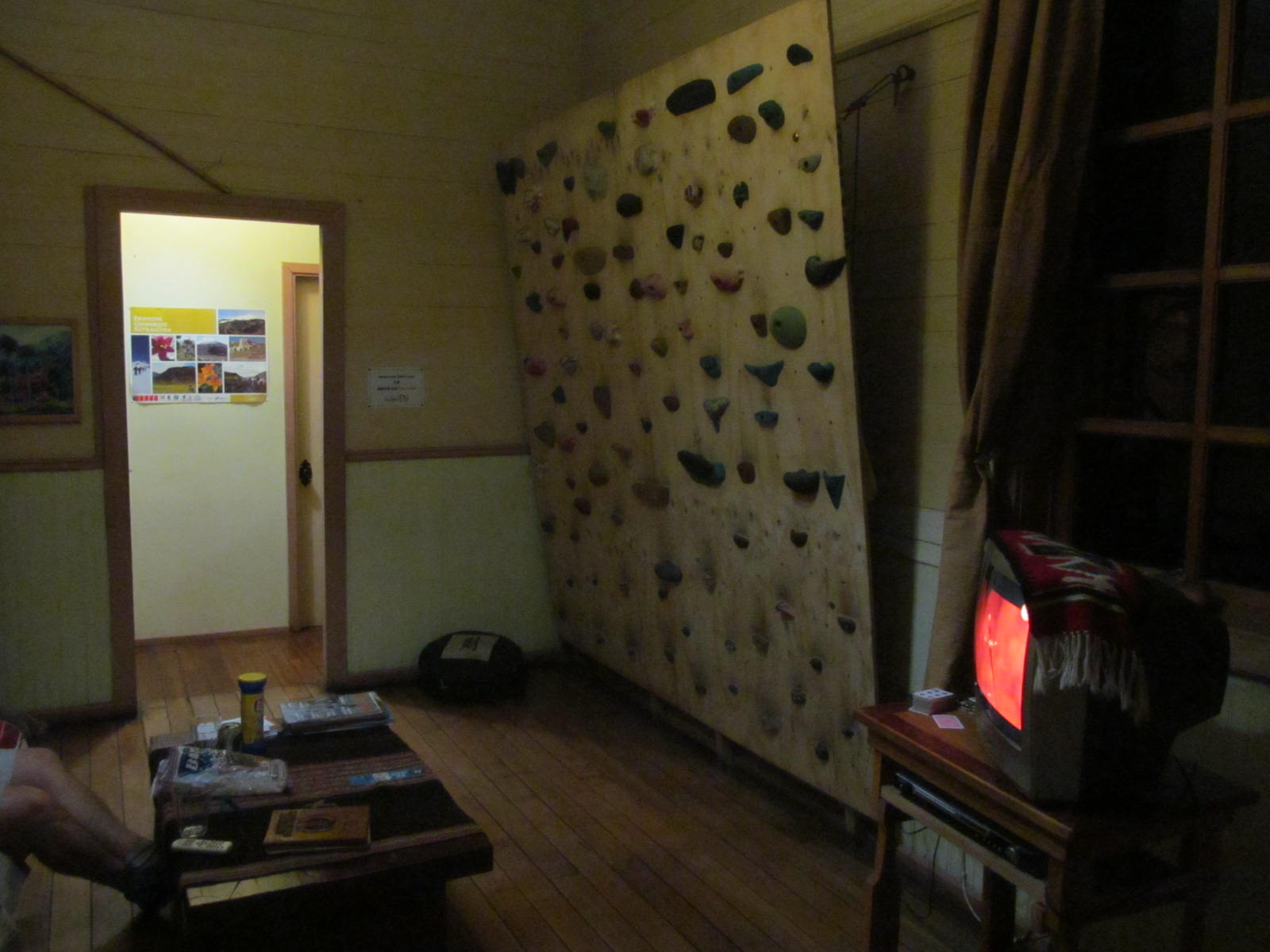 Ao contrário do lado argentino próximo aos Andes, no lado chileno ocorre o o contrário: A umidade do Pacífico fica do lado chileno, o que resulta em muitas florestas e rios (pelo menos do centro do país para baixo). Aliás, o Chile é perfeito para ser percorrido de carro, pois tem mais de 4.000km de norte a sul e cerca de 200km de leste a oeste, e a rodovia Panamericana, em bom estado e bem sinalizada percorre o país de cima abaixo, e outras estradas menores se ramificam a partir dela, dando os acessos laterais. Além disso, o país tem de geleiras (sul) até desertos (norte), passando por praias, florestas, lagos e montanhas. Continuamos a viagem, e pegamos a única chuva da nossa viagem, que durou apenas algumas horas. Atravessamos o túnel Las Raíces, e chegamos na cidade de Curacautín à noite (23hs). Dormimos no Hostel Epu Pewen, pagamos o equivalente a R$40 cada para dormir. O hostel é todo de madeira, tem calefação (à noite faz muito frio), e tem inclusive uma pequena parede de escalada na sala ! Usamos a cozinha do hostel para preparar nosso jantar, comemos e fomos dormir.