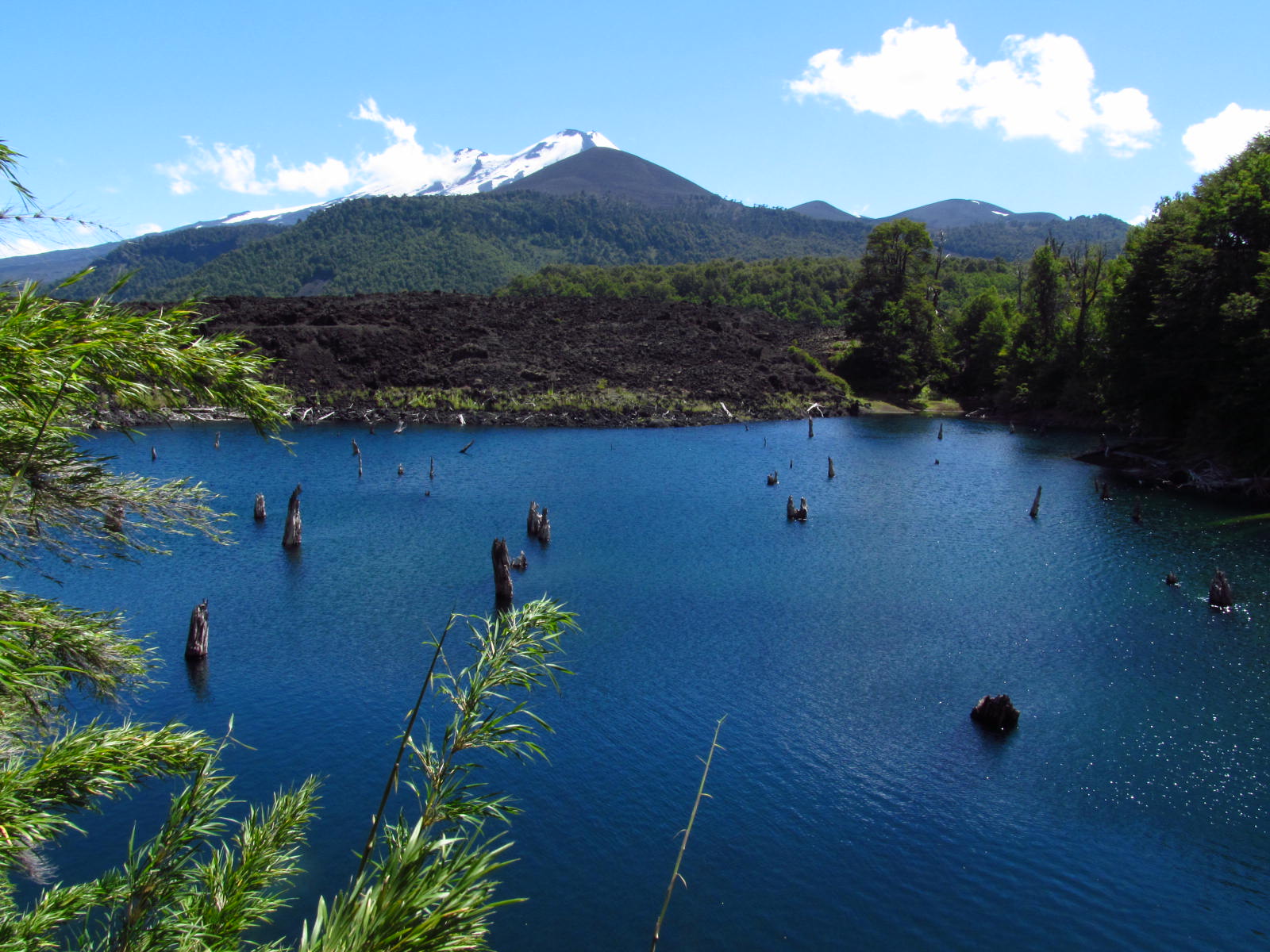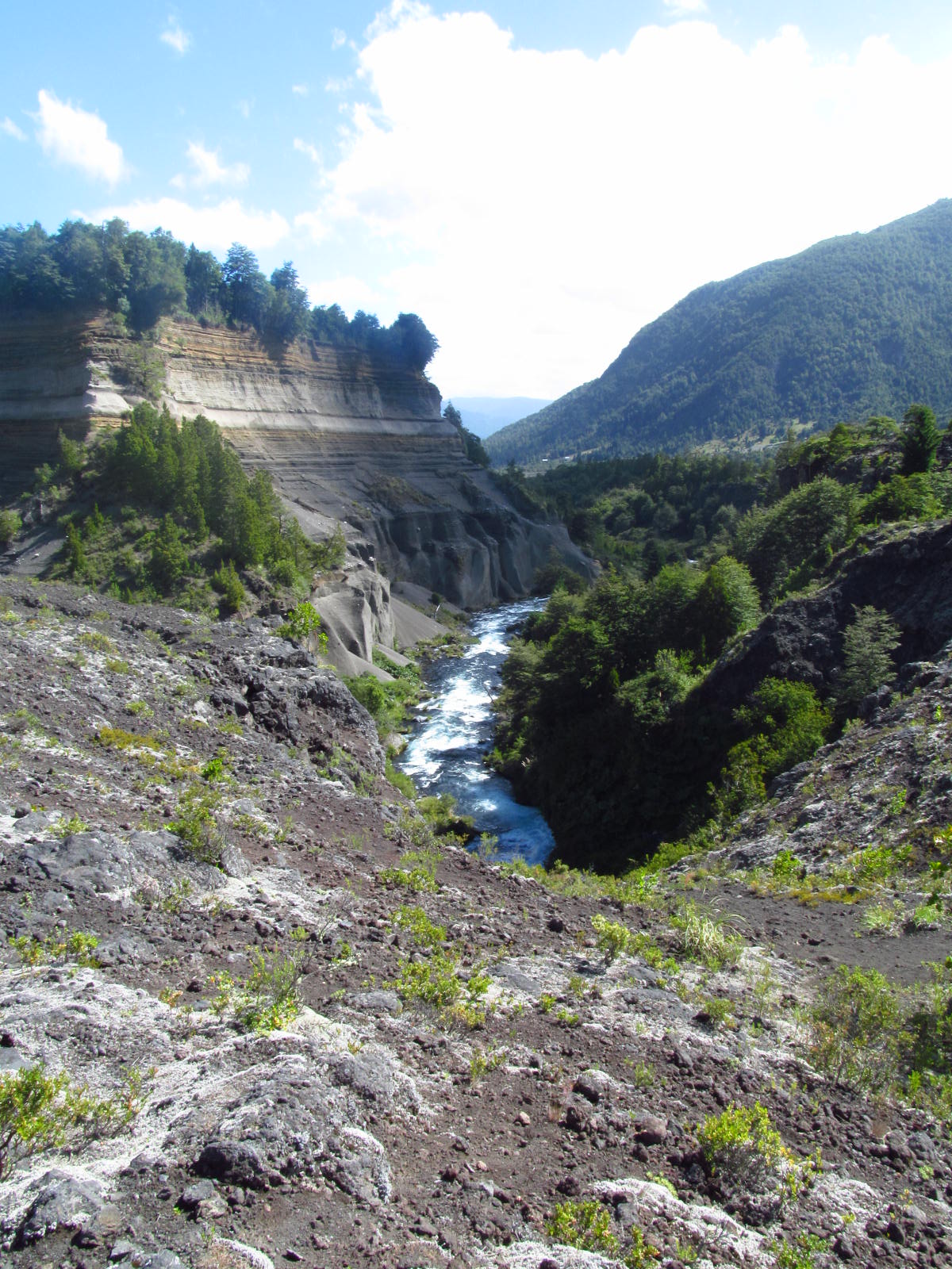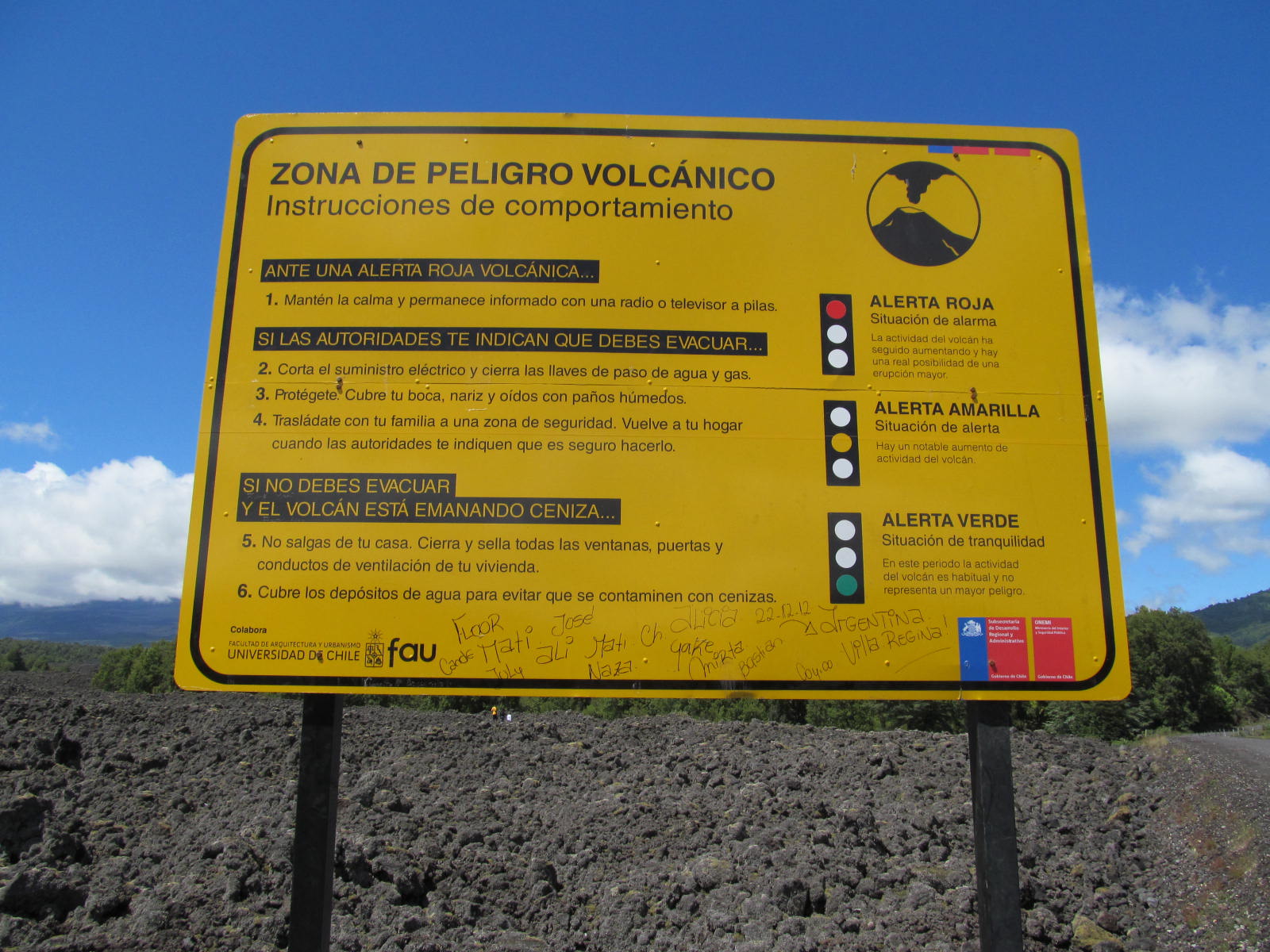 Acordamos, tomamos café, hablamos muito portunhol com os donos do Hostel, e fomos dar uma volta pela cidade. Em seguida seguimos para o Parque Nacional Conguillio. Nos surpreendemos com a organização dos parques por lá. Todos limpos, com trilhas autoguiadas e bem sinalizadas, área de camping, etc. Quem administra é a CONAF, um órgão tipo o Ibama aqui no Brasil. Os parques de lá cobram o equivalente a R$10 ou R$15 para entrar, mas existe um Passe Anual, que custa R$40 e permite a entrada livre em todos os parques do Chile durante um ano. Fizemos esse passe já no Parque Conguillio. Nesse parque há um grande vulcão (inativo), lagos, e florestas de araucárias, que são muito grandes por lá. Tudo muito diferente aqui do Brasil. Também é bem comum por lá ver placas de alerta vulcânico, com um indicativo de como está a atividade na região. O chão e as montanhas do parque são todos cobertos por rocha vulcânica, que é bem escura e muito leve, parece Ovomaltine (rs). Essa tipo de rocha por muito tempo impede o nascimento de plantas no solo. Vimos o Vulcão Llaima (que dá para ver de quase todo o parque), visitamos também a Laguna Arcoiris, que tem um azul atordoante, fizemos a trilha Truful Truful, curtinha, mas dá acesso ao mirante da Cascada Truful Truful (uma cachoeira sensacional) e também ao Corte Geológico, que é tipo um canyon, com várias camadas. Incrível !