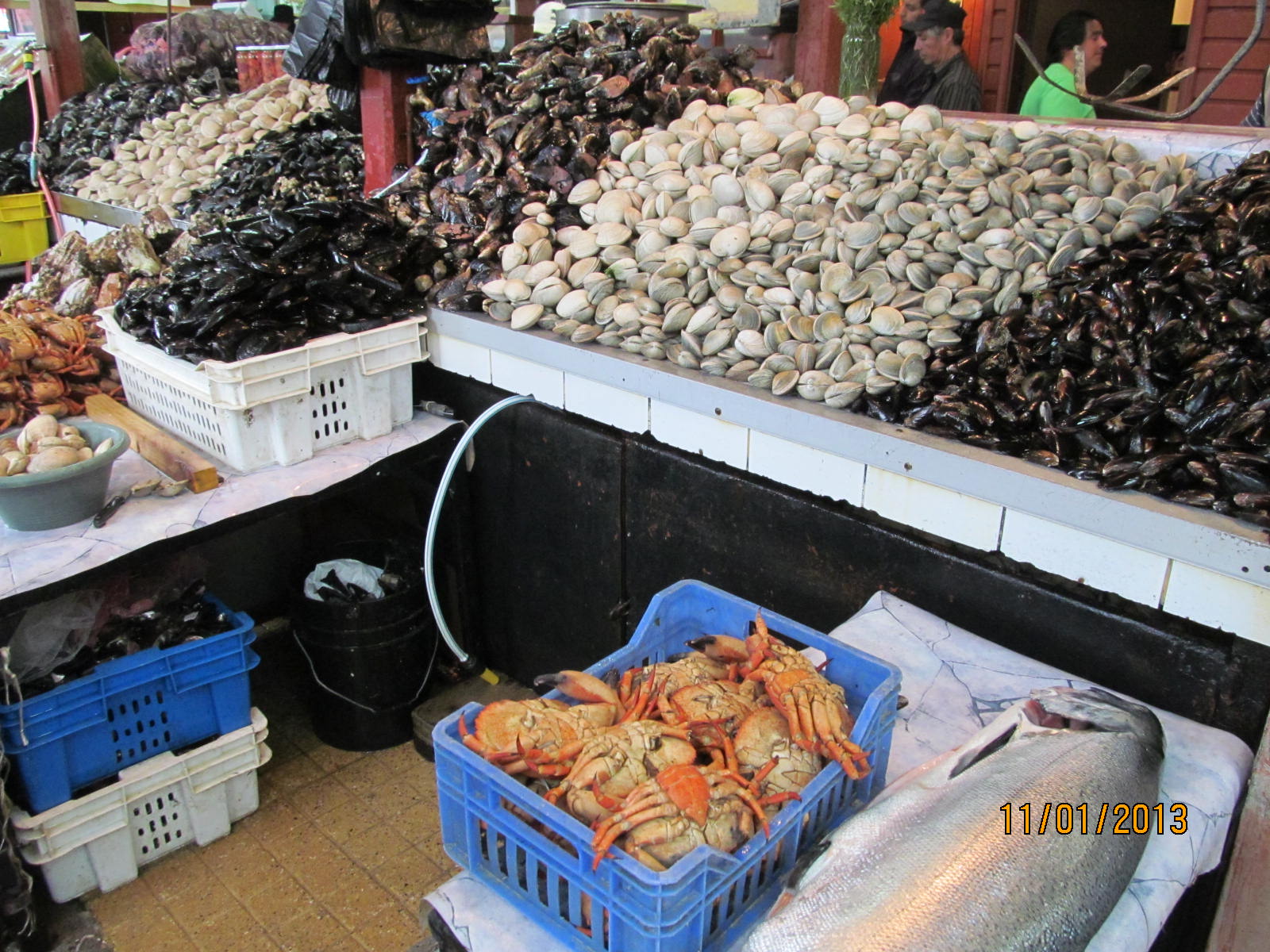 Dormimos em um camping, no meio da cidade (cerca de R$20, com boa estrutura). Lá conhecemos com uma família de Florianópolis que estava fazendo uma viagem parecida com a nossa, mas em um motorhome. Conversamos até tarde, e no outro dia fomos conhecer melhor a cidade. Fomos ao Mercado Municipal, que fica na região portuária. O mercado é todo de madeira, pintado de vermelho, bem diferente. Lá tem muitas bancas com uma infinidade de peixes e frutos do mar a preços muito bons (por exemplo, o filé de salmão defumado custava o equivalente a R$6 o quilo!), tem também algumas bancas de frutas, verduras, legumes, e coisas do tipo, além de restaurantes que servem pratos típicos. Almoçamos a famosa centolla, uma espécie de siri gigante (conhecido também como “king crab”). Depois do almoço passeamos pelas ruas da cidade. Ah, sim, e em Puerto Montt conhecemos o Oceano Pacífico. A água é de um azul que impressiona, mas a temperatura da água não é tão convidativa.