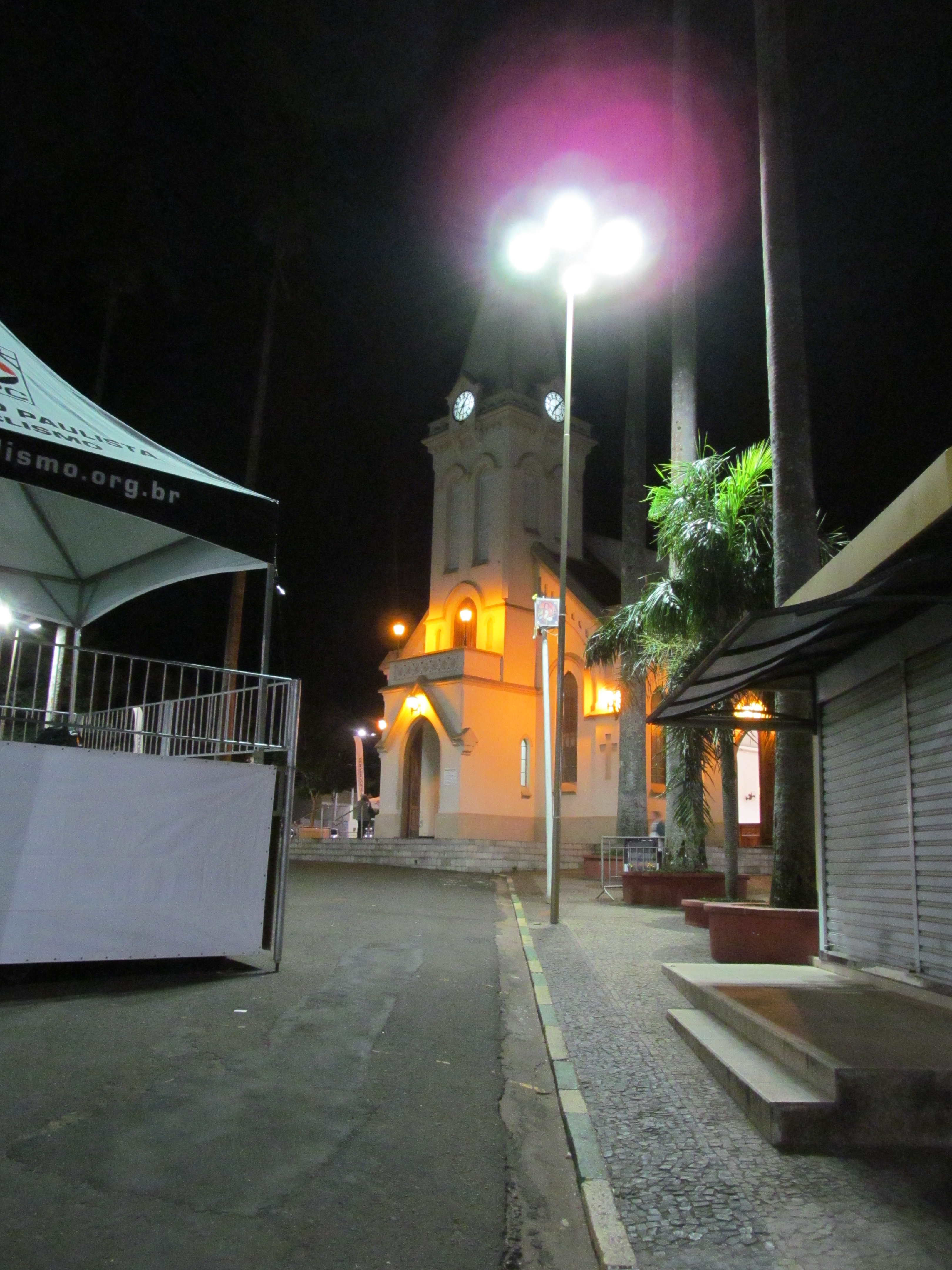 Demos uma passeada lá pelas estradas rurais, confesso que tem muitas opções de camping por lá. Optamos pelo Camping Cascata Dorigon, que fica às margens da rodovia que liga São Pedro à Brotas. Pagamos R$25 cada um a diária do camping, que tem banheiros com chuveiro quente, um bom gramado, piscinas, e a própria cachoeira. O local também possui pousada e restaurante. Pelo que conversamos com os proprietários, eles tinham comprado a propriedade há pouco tempo, e ainda estavam reformando algumas partes. Enfim, chegamos no camping quase à noite, montamos a barraca e fomos até a cidade dar um passeio.