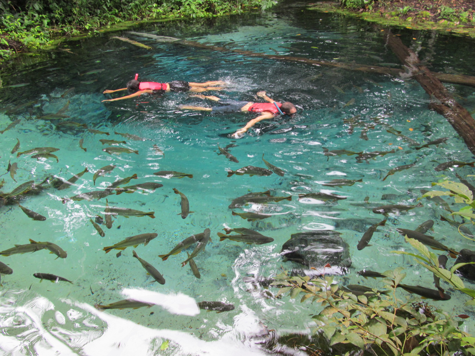 Chegamos finalmente ao Aquário Encantado, que é tipo uma fazenda, com um restaurante e alguns quiosques, tudo bem bonito e arrumado.  Chegando lá entregamos as entradas, e nos comunicaram que poderíamos comprar o mesmo ingresso na própria fazenda por cerca de R$80 por pessoa. Ou seja, a agência de turismo cobrou  R$20 a mais por pessoa pelo mesmo passeio. Bem feito pra nós que acreditamos no cara da pousada. Ok, fica a dica para que for nesse passeio: Nada de agência de turismo !!! Enfim, colocamos o colete, as papetes e os snorkels/máscaras, e fomos levados (de trator) até o rio. Ali ficamos impressionados com a beleza do local e a cor da água, além dos inúmeros peixes !