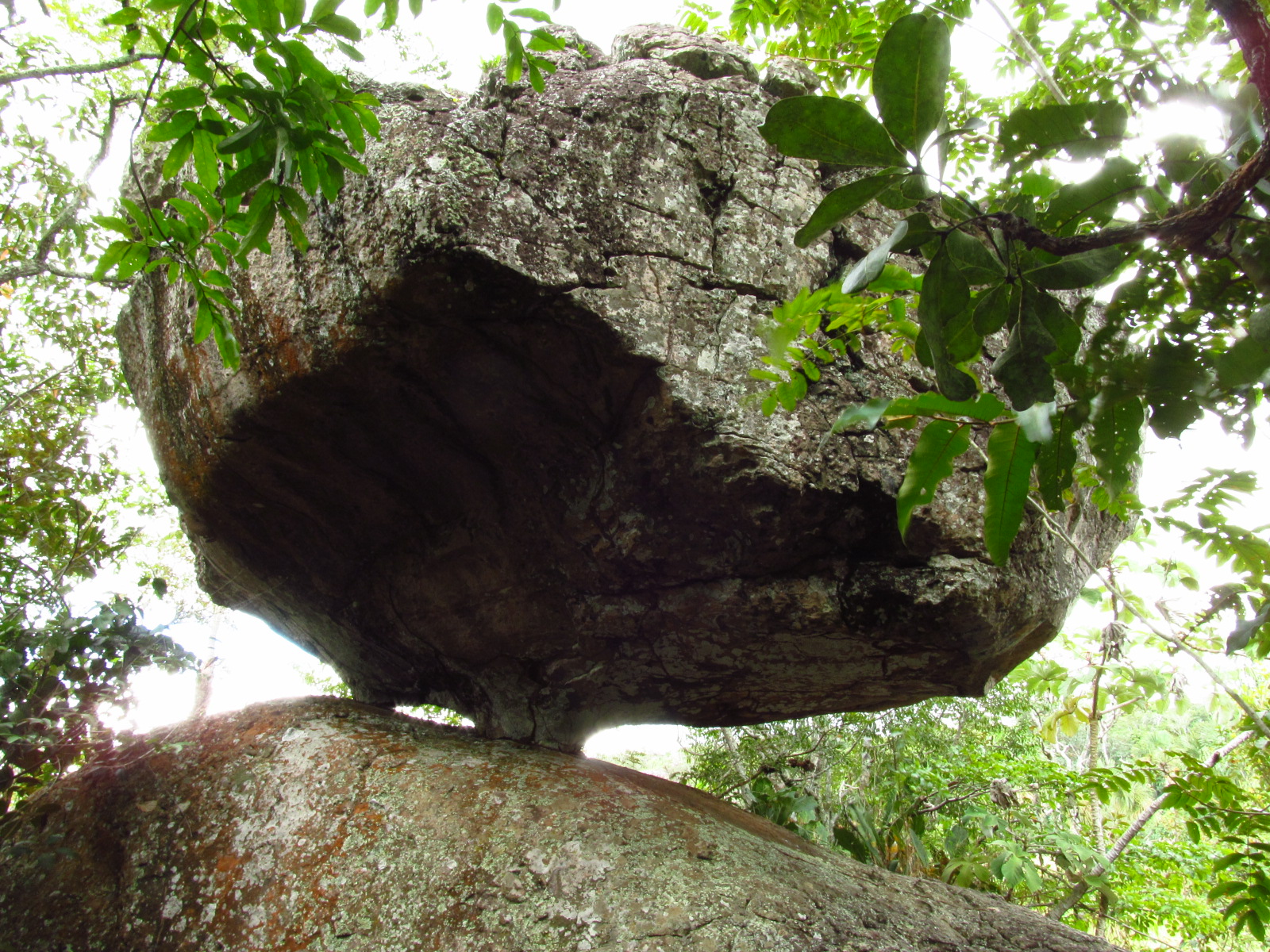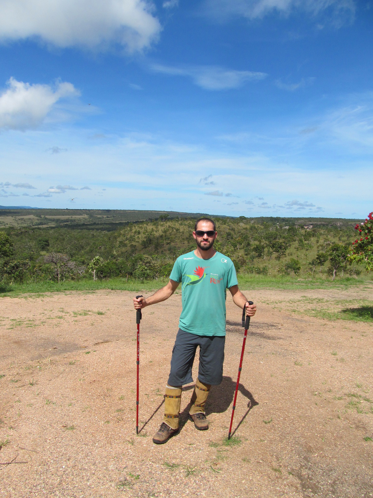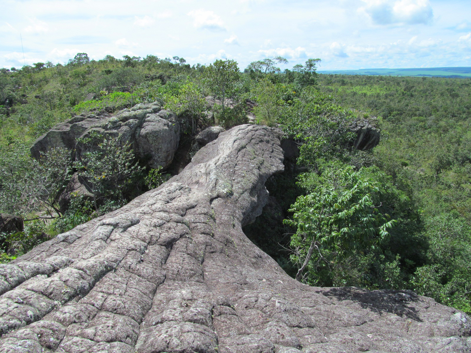 Continuamos a trilha, que não é pesada, mas o sol desgasta muito. Passamos por algumas partes com mata, muitas áreas de cerrado, pontes e formações rochosas muito interessantes. Chegamos então à Caverna Aroe Jari. Uma pena não podermos entrar, pois a caverna parece ser muito interessante.