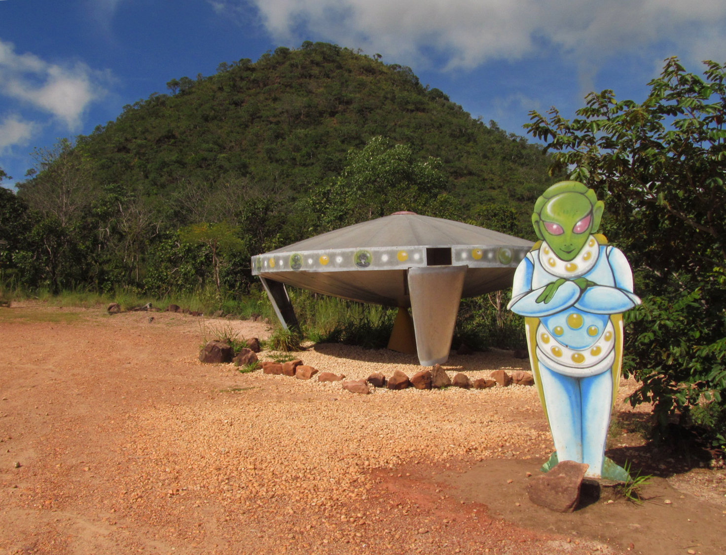 Pegamos o carro e fomos visitar também o Parque Estadual da Serra Azul, com entrada gratuita. Fomos com o carro por algumas ladeiras de terra até o curioso Discoporto. Sim, um local para pouso de discos voadores ! E o pessoal de lá jura que às vezes chegam discos voadores no parque. O local é engraçado, tem várias placas e estátuas de alienígenas, inclusive uma réplica de um disco voador em “tamanho real”. Também no topo de um dos morros lá perto há um Cristo Redentor com uma vista magnífica das cidades.
