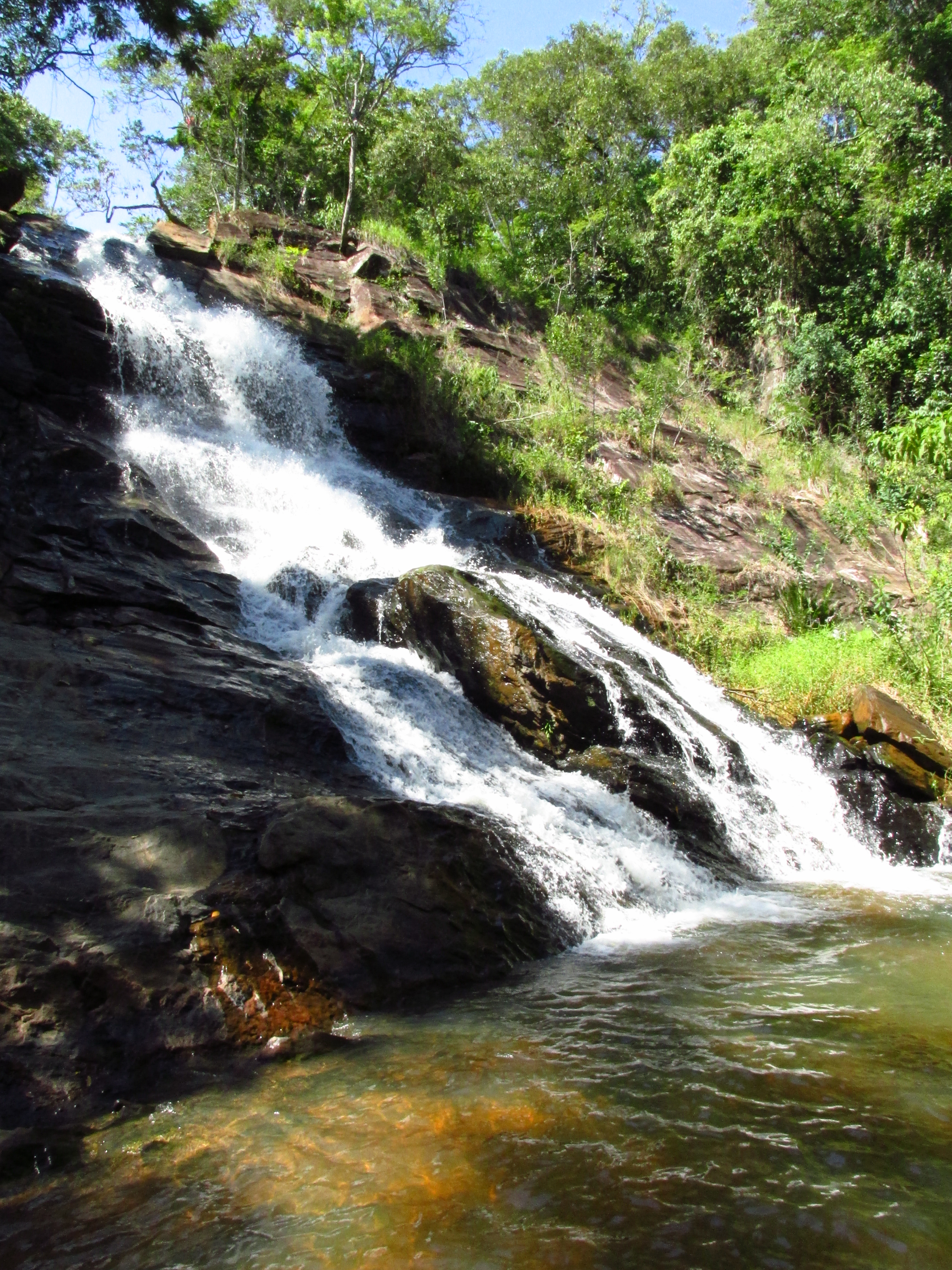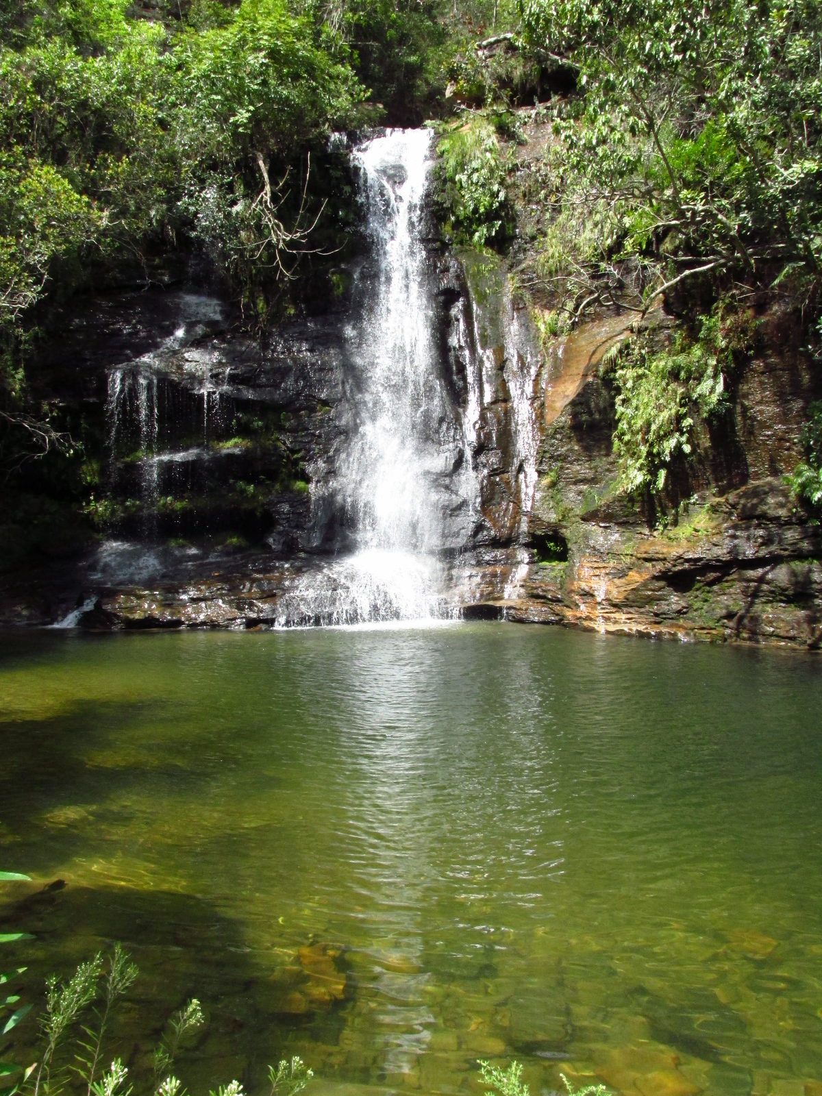 Ok, começamos a descer pelo outro lado do morro, em direção à cachoeira. Chegamos então a um sítio bem simples, e os moradores nos receberam muito bem. Todos os carros que estavam por lá (uns 5 no total) eram 4×4. Enfim, nosso sofrimento para chegar até lá foi justo. Pagamos R$10 cada na entrada e nos indicaram uma trilha para a cachoeira. Andamos uns dez minutos e então chegamos. Lá vimos que o esforço valeu a pena. A cachoeira é deslumbrante! Apesar da água gelada, não resistimos a um bom banho !