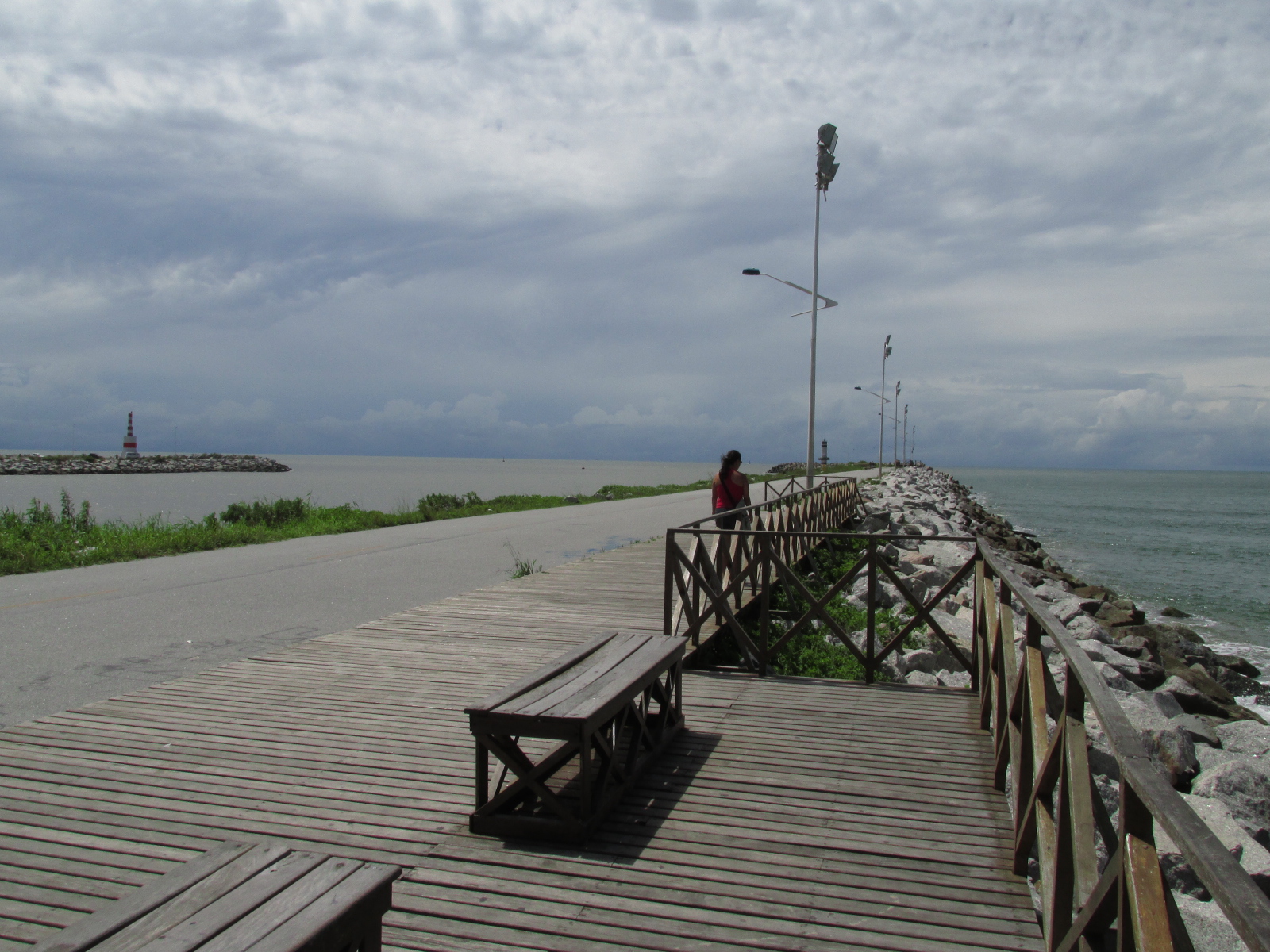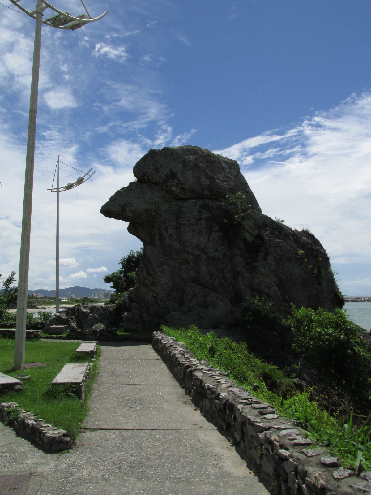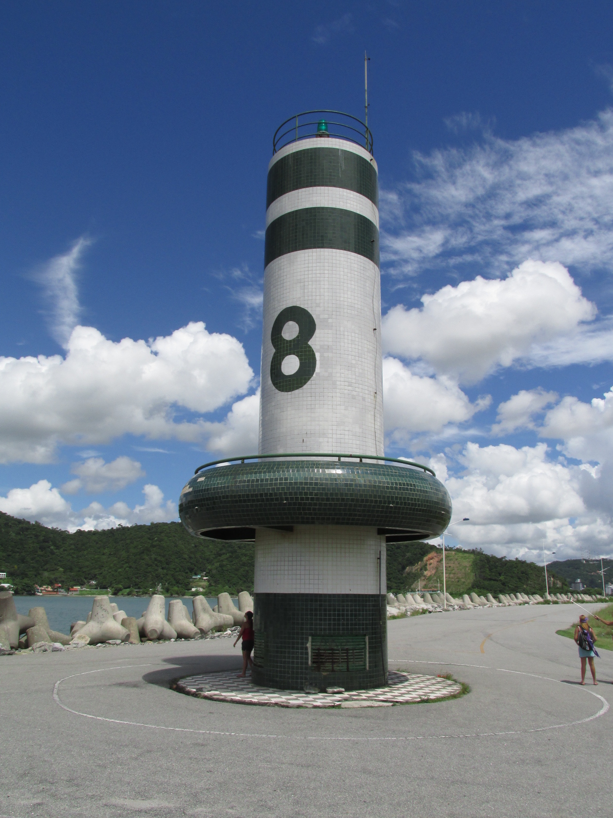 Como ainda estava cedo para almoçar, fomos conhecer mais alguns atrativos da cidade. Conhecemos o Farol e Molhes da Barra (que é um pedaço de terra que entra no mar, formado um canal onde os navios seguem para o porto. Na ponta dele fica o farol. Paramos o carro perto da praia e seguimos a pé até o farol. A entrada é gratuita. Perto da praia, também vimos a Pedra do Papagaio. Paramos em frente à Praia de Cabeçudas para preparar nosso almoço (com vista para o mar !). A praia é linda, o mar é muito verde e há muita vegetação nativa e pedras próximas.