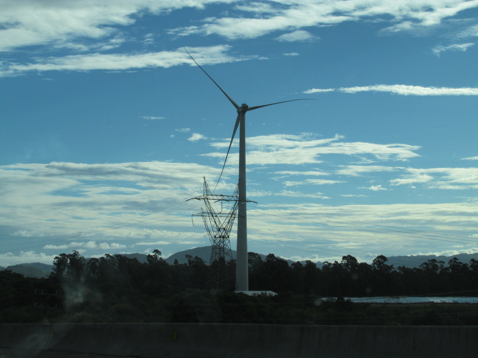 Seguimos de viagem, pelo litoral catarinense, parando em mais algumas praias, mas sem ficar muito tempo. Já no final da tarde, saímos do litoral e adentramos no estado, rumo à Serra do Rio do Rastro, um caminho que eu sempre quis conhecer, e é realmente uma lenda entre os apaixonado por estrada. No caminho, vimos algumas turbinas de captação de energia eólica, e ficamos impressionados com o tamanho da geringonça ! Cada uma da três hélices tem cerca de cinquenta metros ! Repare na foto abaixo o tamanho da torre de energia em frente à ela !