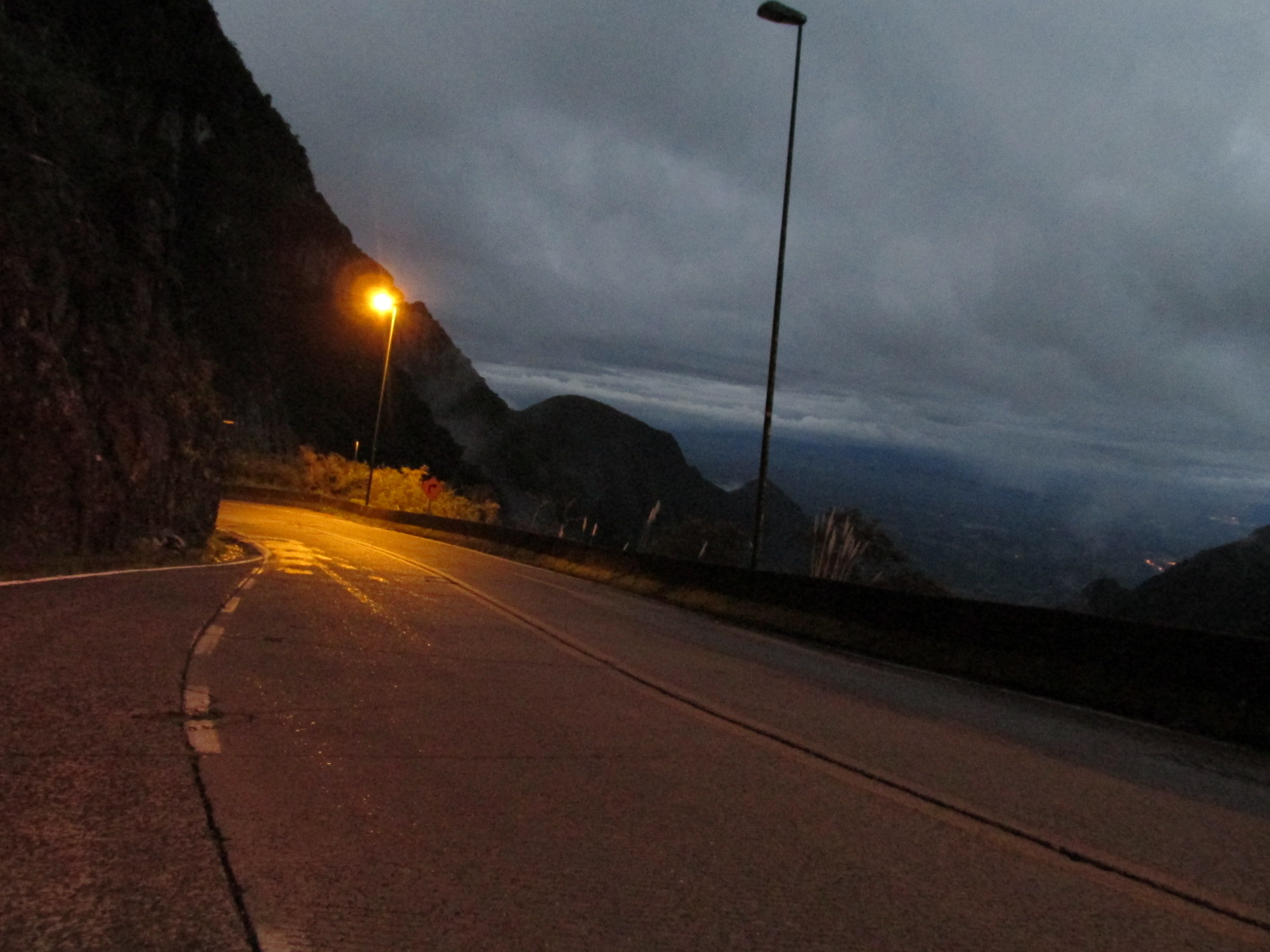 Chegamos bem no final da tarde aos pés da Serra do Rio do Rastro, que liga o litoral à Serra Catarinense. A serra é realmente impressionante, conseguimos subir com o dia ainda claro, e chegamos à noite na parte de cima. O que espanta também é a diferença de temperatura, embaixo da serra fazia calor, e quando chegamos lá em cima estava um vento muuuuito gelado. Bom, as curvas da serra dispensam comentários. De tão fechadas, o volante do carro quase chega no final. E à noite a serra ganha uma beleza especial, fica toda iluminada !