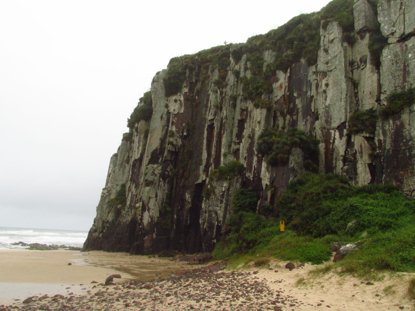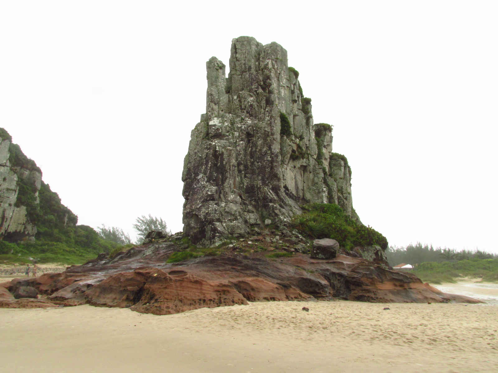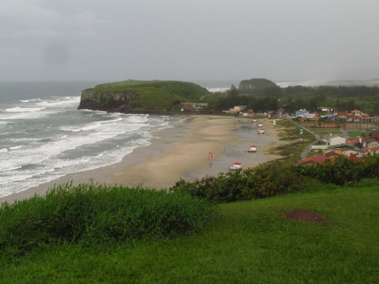 Descemos a serra e seguimos mais alguns quilômetros até parar para dormir em um motel em Criciúma. O dia seguinte amanheceu chuvoso, mas mesmo assim seguimos rumo ao litoral para conhecer a cidade de Torres-RS. Lá fomos até um mirante com vista para o a Praia da Guarita onde está localizado o Parque Estadual da Guarita. Ficamos algum tempo embaixo de chuva apreciando a vista da praia (sensacional), e assim que a chuva deu uma trégua fomos até o parque para conhecê-lo melhor. No local, paga-se R$10 por pessoa para entrar e dá direito à visitação da praia e também a uma trilha sobre as falésias do parque. Não pudemos fazer a trilha, pois os monitores do parque nos alertaram sobre o perigo de fazer a trilha em dias de chuva. Mas a praia já valeu a entrada no parque. Além das falésias margeando o oceano, bem em frente à praia há um grande morro de pedra, que parece mesmo uma torre (guarita).