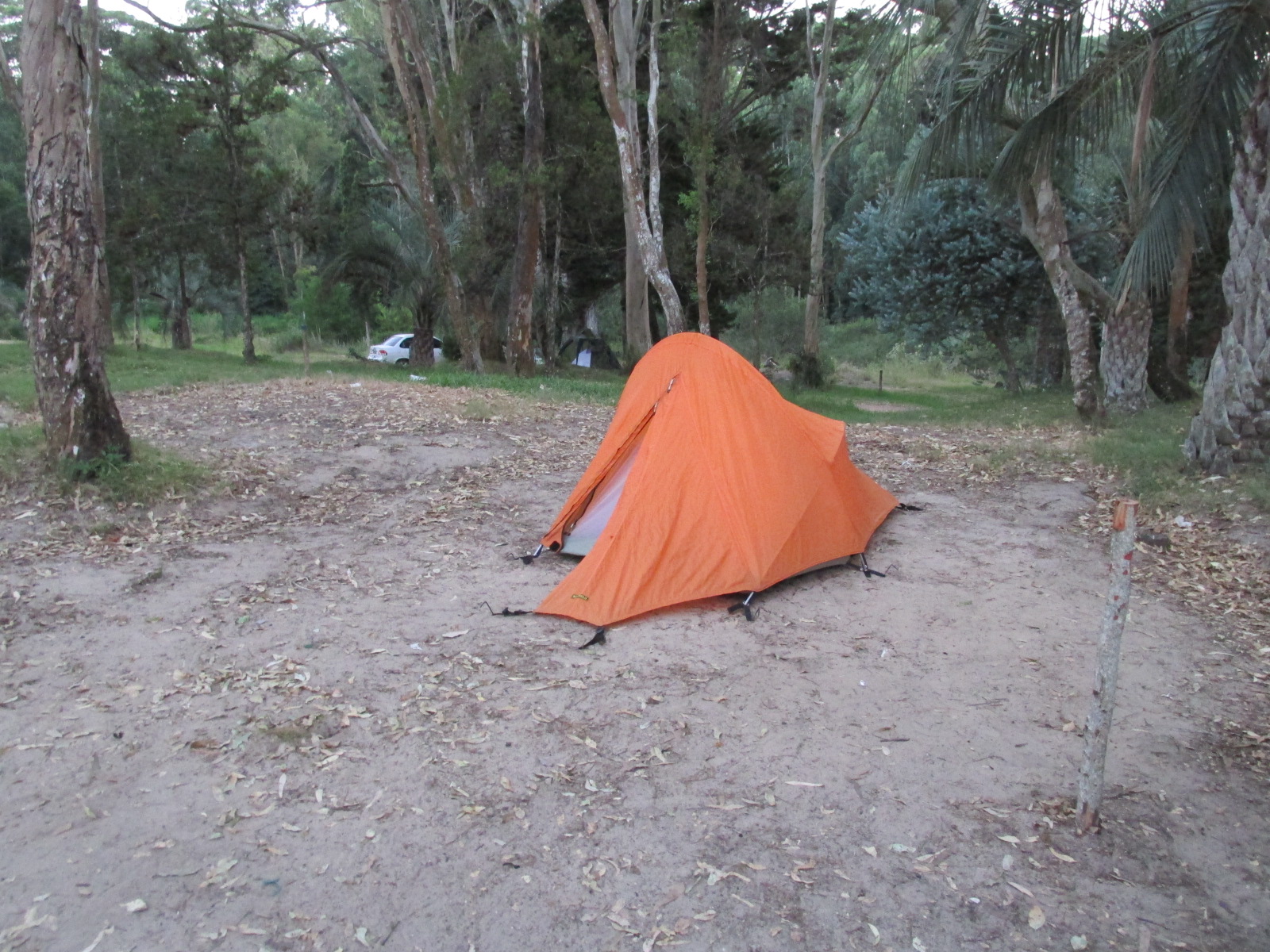 Saímos da fortaleza e fomos conhecer mais um atrativo do parque. Chegamos até a praia La Moza, que tem um mirante de baleias (!), mas não estava na época certa e não conseguimos ver, rs. As praias tem muitas pedras e o mar muito agitado. Saímos de lá e fomos para a área de camping, que é muito arborizada, tem torneiras e tomadas. Pagamos R$25 cada um para acampar. No local há uma grande bateria de chuveiros quentes (muito bons). O parque ainda conta com mercado, chalés para aluguel e telefones.