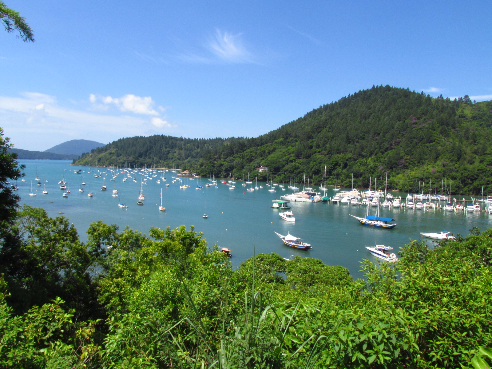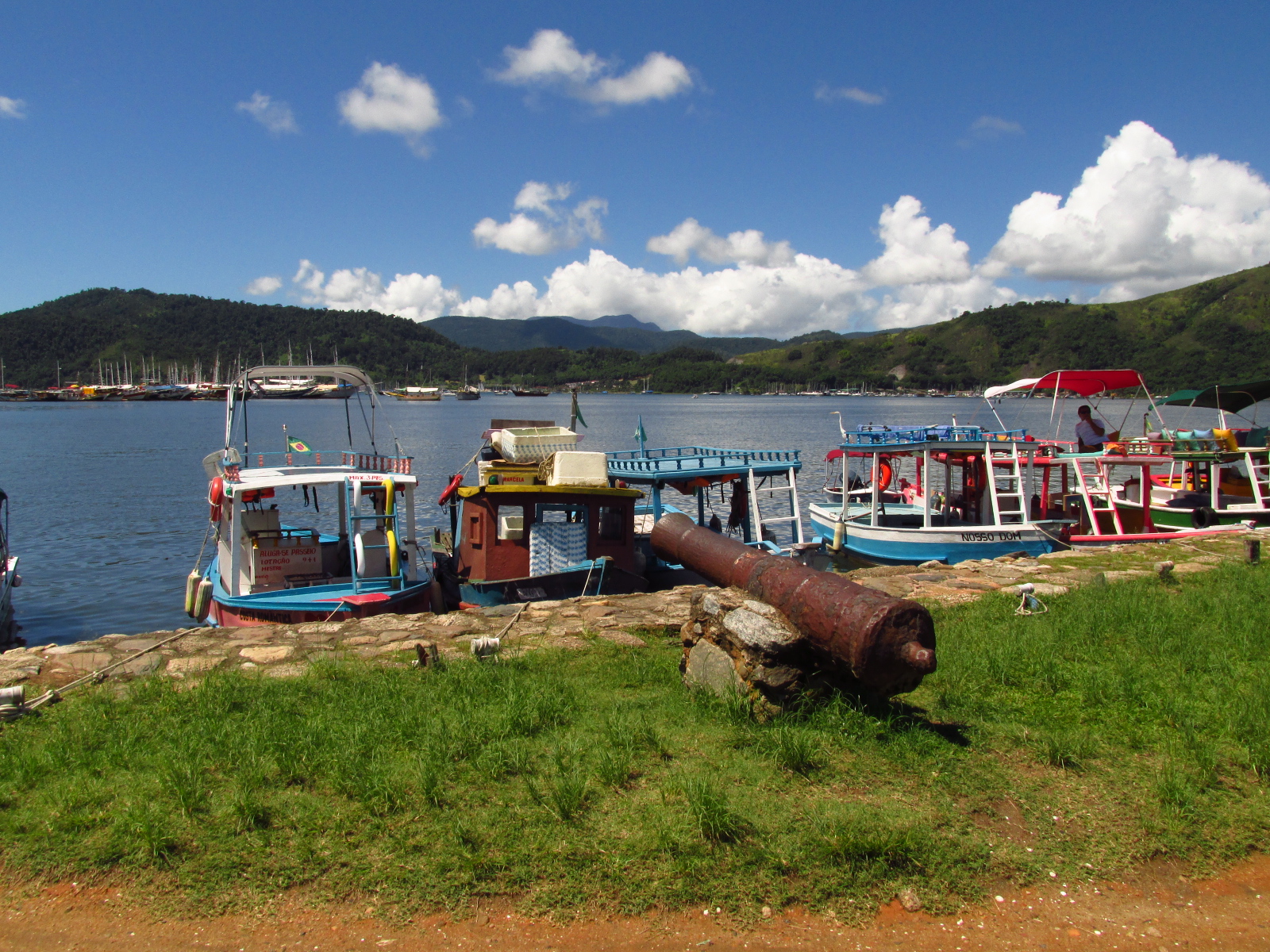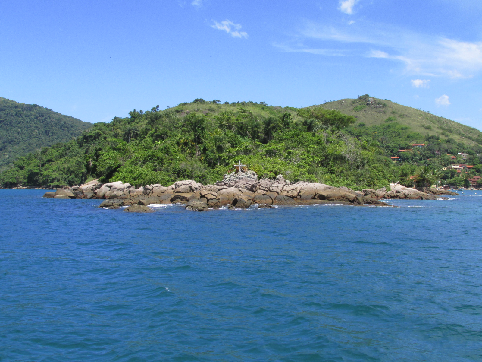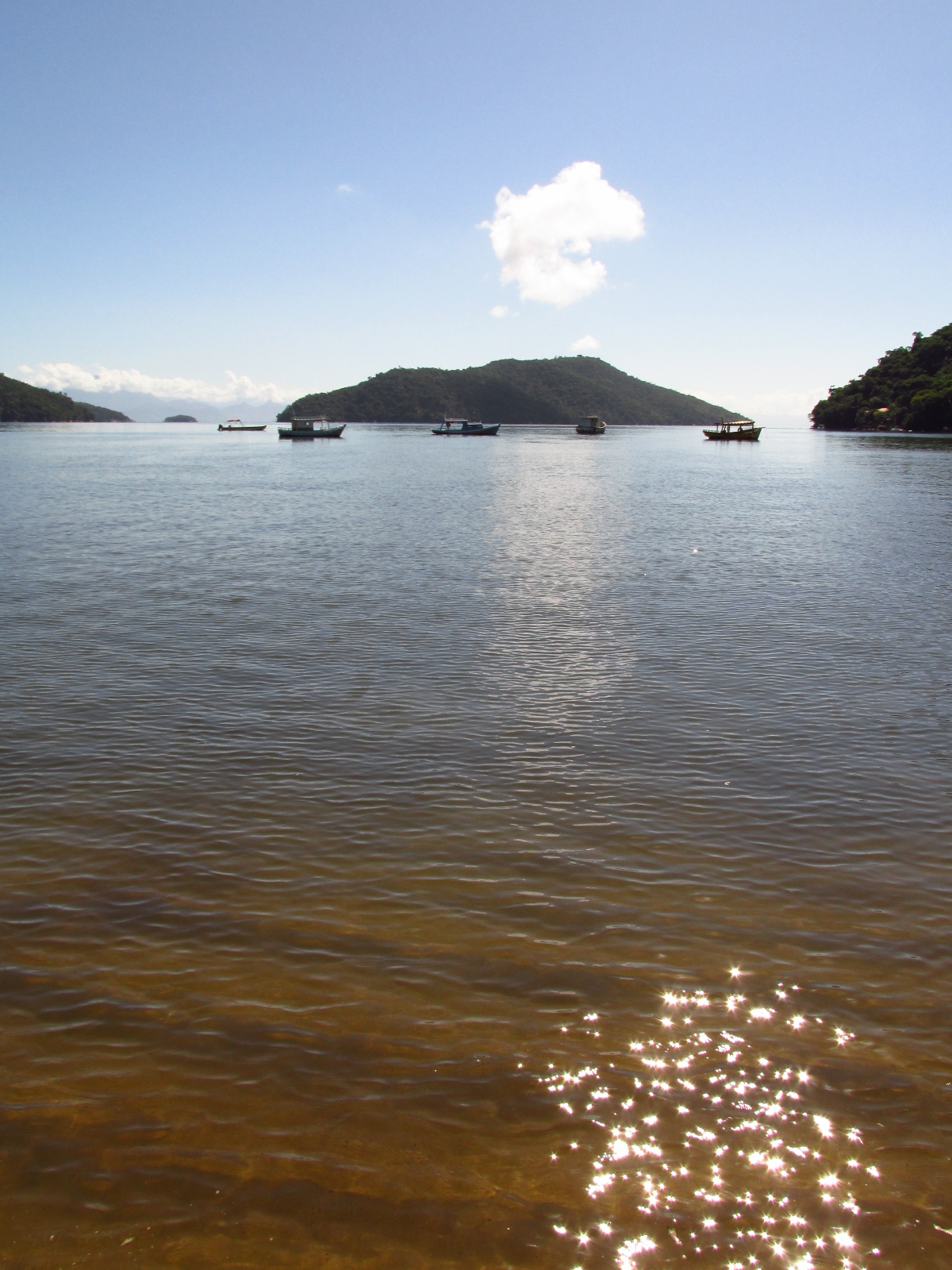 Nesse dia, deixamos o Mambo no camping (coitado, rs) e fomos para Paraty fazer um passeio de escuna. Lá tem dois tipos de passeio, um deles, que é mais “privativo”, que você pode alugar um barco (para até 5 pessoas), e paga cerca de R$250 no passeio de 3 horas, com 3 ou 4 paradas, e outro passeio é feito em uma escuna (bem maior), com cerca de 20 pessoas e 3 paradas, pagando R$40 cada com almoço e frutas inclusos. Mas dá para pechinchar, porquê no local há vários barqueiros disputando os turistas. Na escuna também é vendido bebidas. Optamos pelo segundo passeio. O barco saiu às 11hs de Paraty e foi passando ao lado de ilhas paradisíacas. A cor da água varia entre verde e azul, muitíssimo limpa.