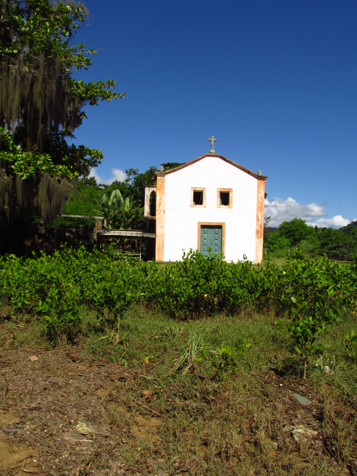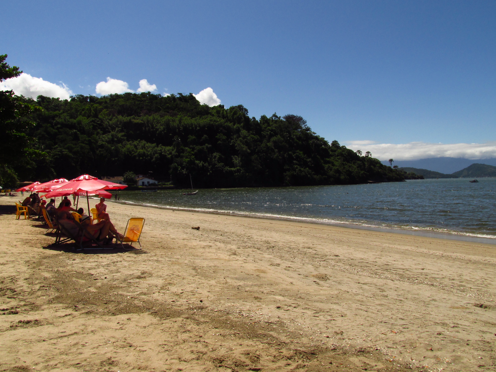 Saímos então conhecer as praias. Pra começar, fomos até a praia Paraty-Mirim, que fica no bairro de mesmo nome, a apenas 200m do camping. A praia é muito bonita, a água lá, talvez pela areia ser mais grossa, é mais transparente que a água do litoral sul de São Paulo. E há muita mata nativa que cercam as praias. Também há uma igrejinha bem antiga próximo da praia e um bar. Nesse dia só estávamos nós por lá.