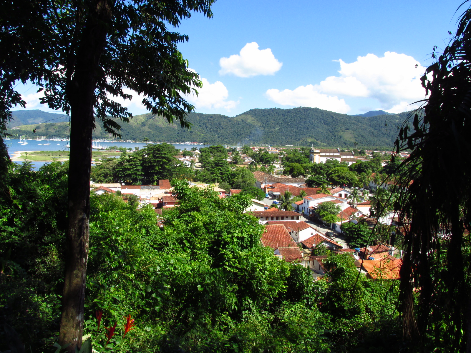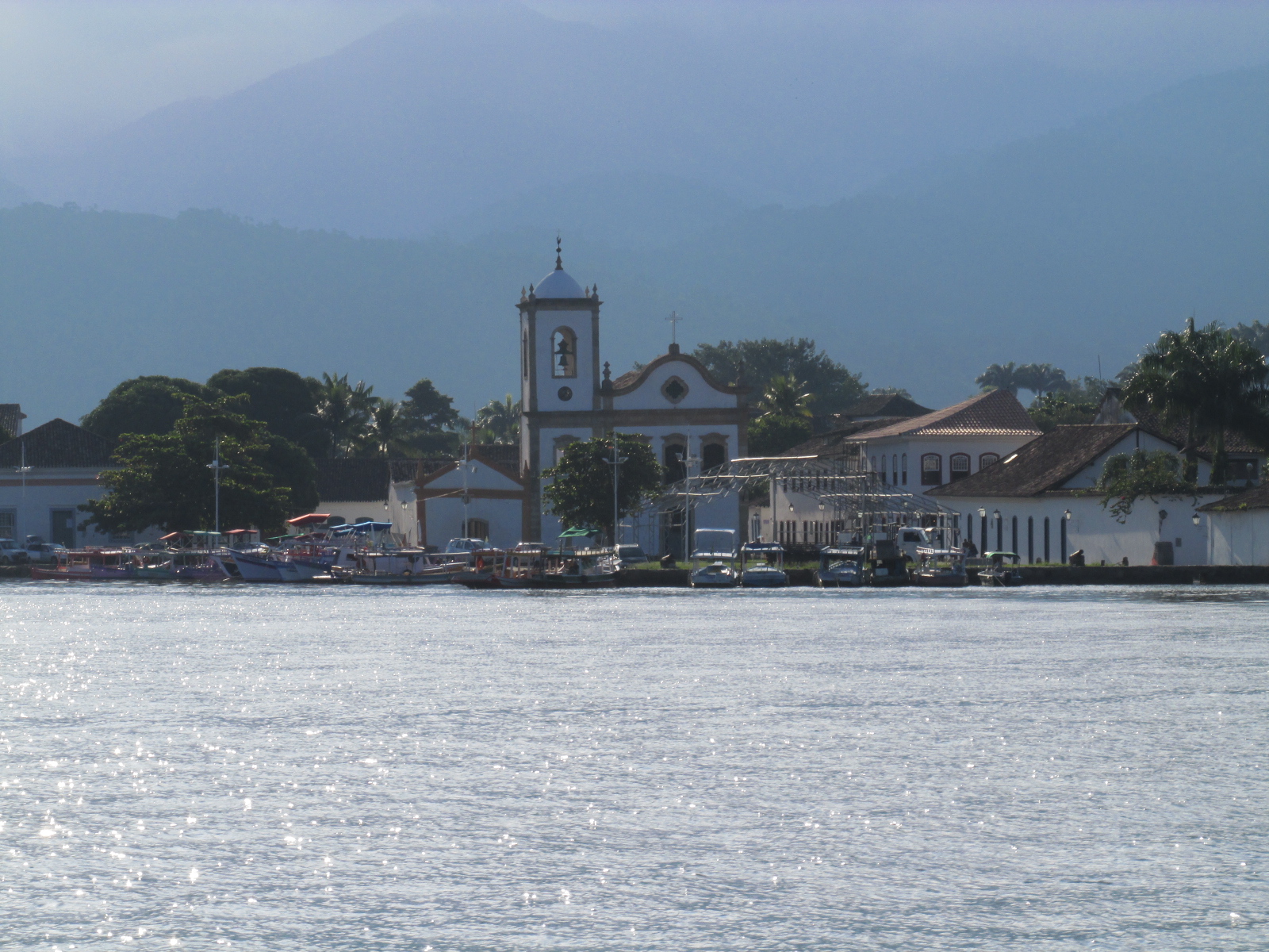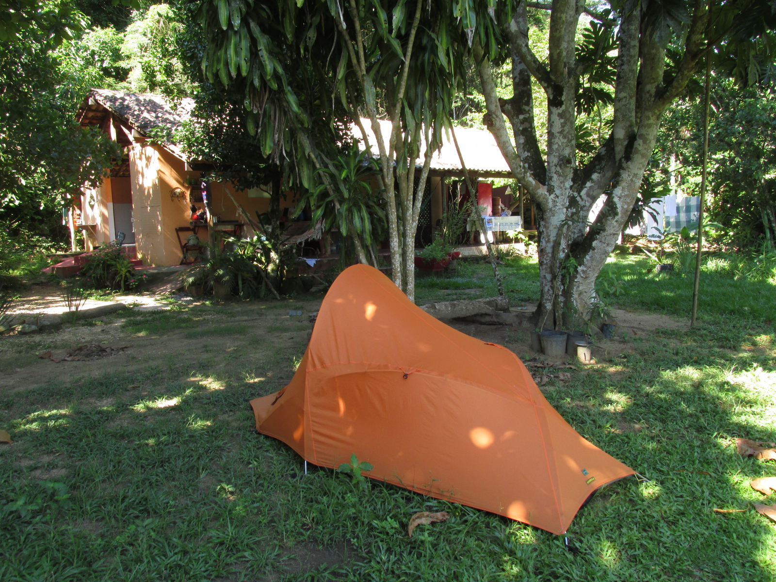 Chegamos do Uruguai dia 23 de março, e no dia seguinte resolvemos algumas coisas em Bauru. Como eu ainda tinha uma semana de férias, resolvemos aproveitar mais um pouco. Decidimos então ir a Paraty, litoral sul do Rio de Janeiro. Saímos de Bauru depois do almoço, por volta das 14hs e viajamos a tarde toda (614 km), até chegarmos já à noite em Ubatuba-SP. Aliás, aquela serra que liga São Luís do Paraitinga a Ubatuba, à noite e com chuva é bem perigosa ! Cuidado ! Seguimos então para o bairro de Paraty-Mirim, que fica entre a vila de Trindade e Paraty. Custamos a encontrar a entrada, mas após algumas idas e voltas erradas, encontramos. Daí então foram alguns quilômetros de chuva, terra e barro até o camping que tínhamos reservado, o Paraty Paradiso. Pagamos R$25 cada um a diária. Ao chegar fomos muito bem recebidos pelo proprietário. Armamos a barraca, e boa noite! No dia seguinte acordamos com um dia lindo, e pudemos ver melhor o camping. Muito arborizado, árvores frutíferas, horta orgânica, gramado bom, cozinha coletiva com churrasqueira, geladeira, pia e utensílios, banheiros limpos, tudo organizado! O local também tem uma pousada, toda de madeira, super legal.