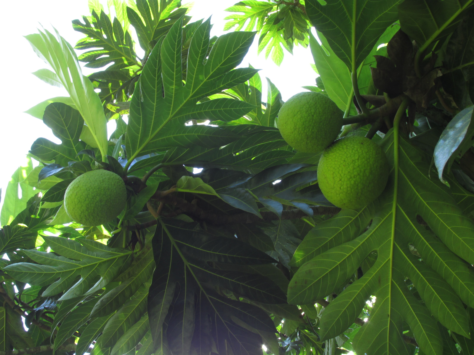 Depois de retornar para o camping para um merecido descanso, acordamos na manhã seguinte por volta das 9hs, e reparamos na grande árvore que estava ao lado de nossa barraca: Um é de fruta-pão carregado! Há muitos anos eu não via essa fruta, nem lembrava mais qual era o gosto. O dono do camping pegou algumas e cozinhamos… O sabor e textura lembra um pouco o de mandioca. Comemos um monte e ainda levamos algumas para Bauru ! Até o Mambo gostou !