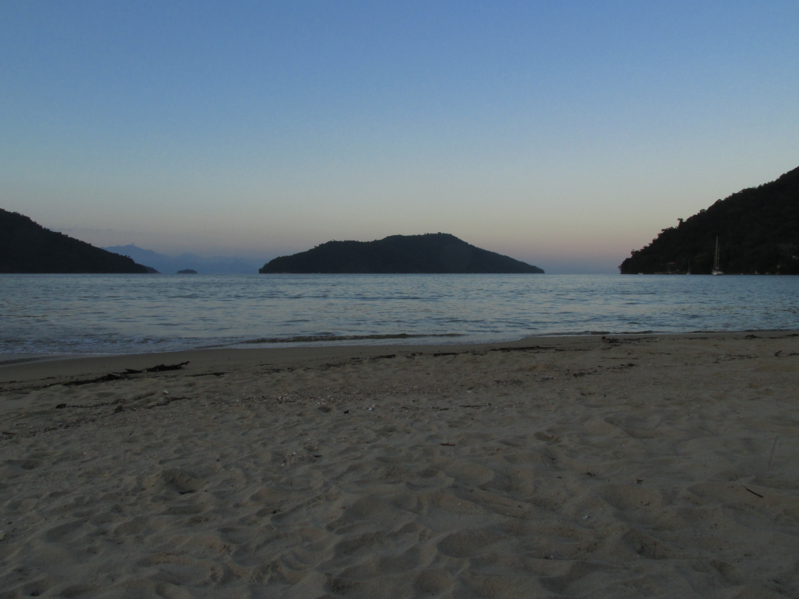 Depois do passeio de barco, passamos no camping, pegamos o Mambo e fomos novamente para a praia Paraty-Mirim, para ver o pôr do sol. Estendemos uma toalha na areia e ficamos ali, relaxando e observando a natureza.