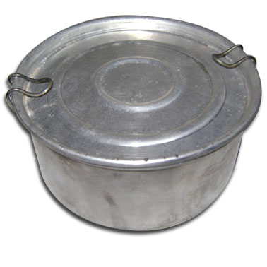 Uma marmita de alumínio, dessas bem ordinárias. Qualquer lojinha de utilidades domésticas tem. Custa por volta de R$8,00