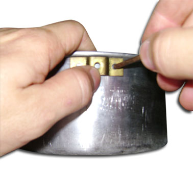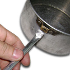 Um cano de alumínio de 12cm por 1cm de diâmetro. A espessura do alumínio (da “parede”) deve ter no mínimo 2mm para suportar o peso da panela. A extremidade deve ser amassada (com martelo ou alicate) e dobrada em 90° . A parte dobrada deve ter cerca de 1,5cm