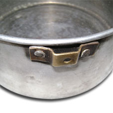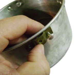 Veja no detalhe como o cabo vai encaixar por baixo na chapa rebitada. A distância entre a chapa e a lateral da panela deve ter a mesma espessura da ponta amassada da barra de alumínio. O encaixe deve se justo, mas é importante que se consiga colocar e retirar o cabo sem segurar a panela, pois haverá ocasiões em que ela estará muito quente.
