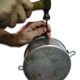 Assim que marcar os locais dos furos, use o prego e o martelo para furar a marmita. Deve-se usar a quina de uma mesa ou bancada para apoiar a marmita por dentro, para que não amasse sua lateral.