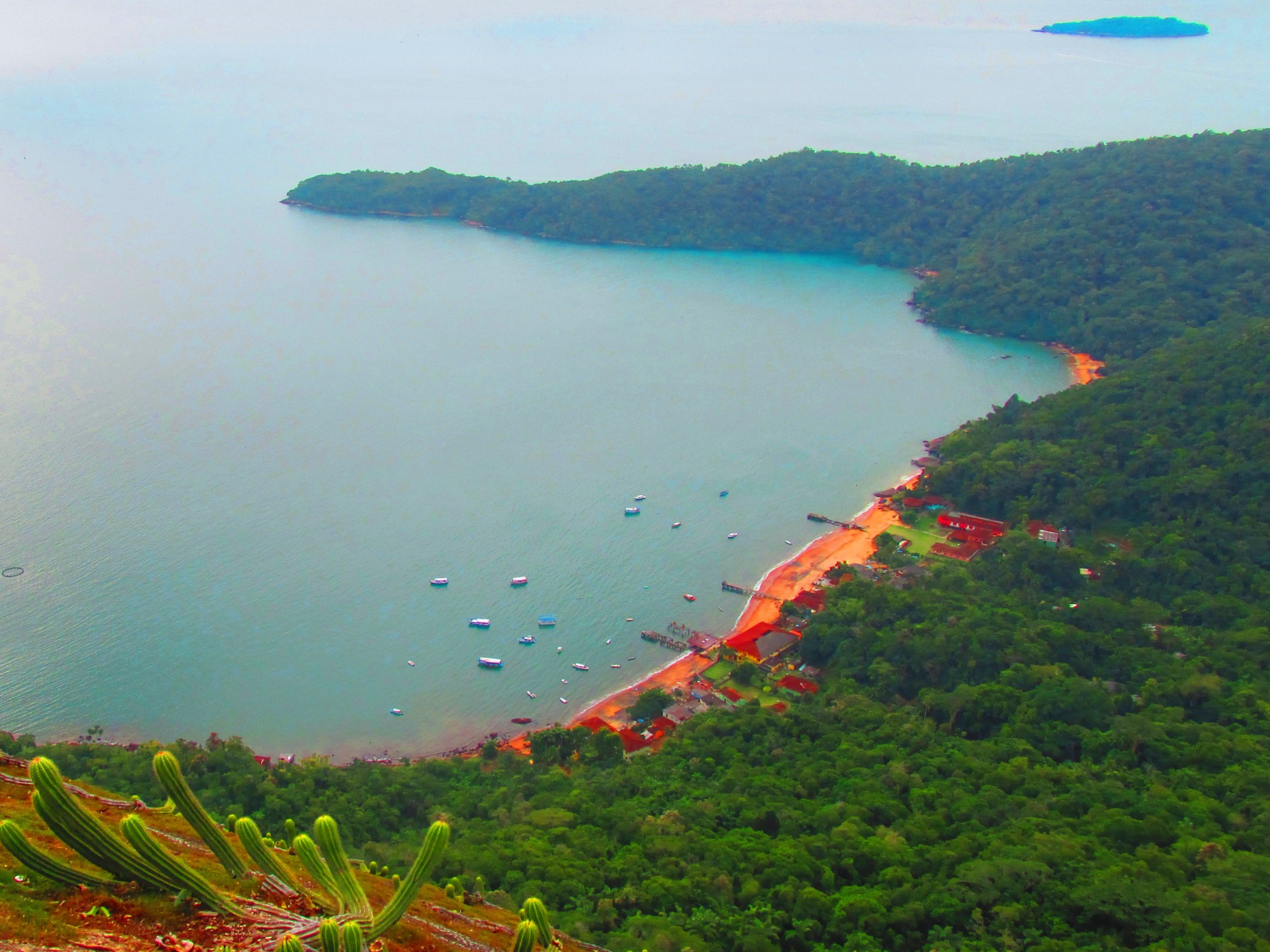 Começamos a trilha, e após uns caminhos errados, bifurcações e parar em umas casas pedir informações, acertamos a trilha. Mata fechada, um cenário muito bonito, vários pés de jaca e subida, muita subida. Depois subir cerca de 40 minutos, o casal paulistano achou melhor descer. Eu e a Mi continuamos. Sobe, sobe, mais uma meia hora. Enfim, chegamos. E lá de cima, vimos como valeu a pena. O mirante é sobre uma enorme pedra, e a vista é de tirar o fôlego. De lá é possível ver além da Praia do Bananal, diversas ilhas, muita mata, morros e outras praias. Ficamos lá em cima admirando cerca de meia hora!