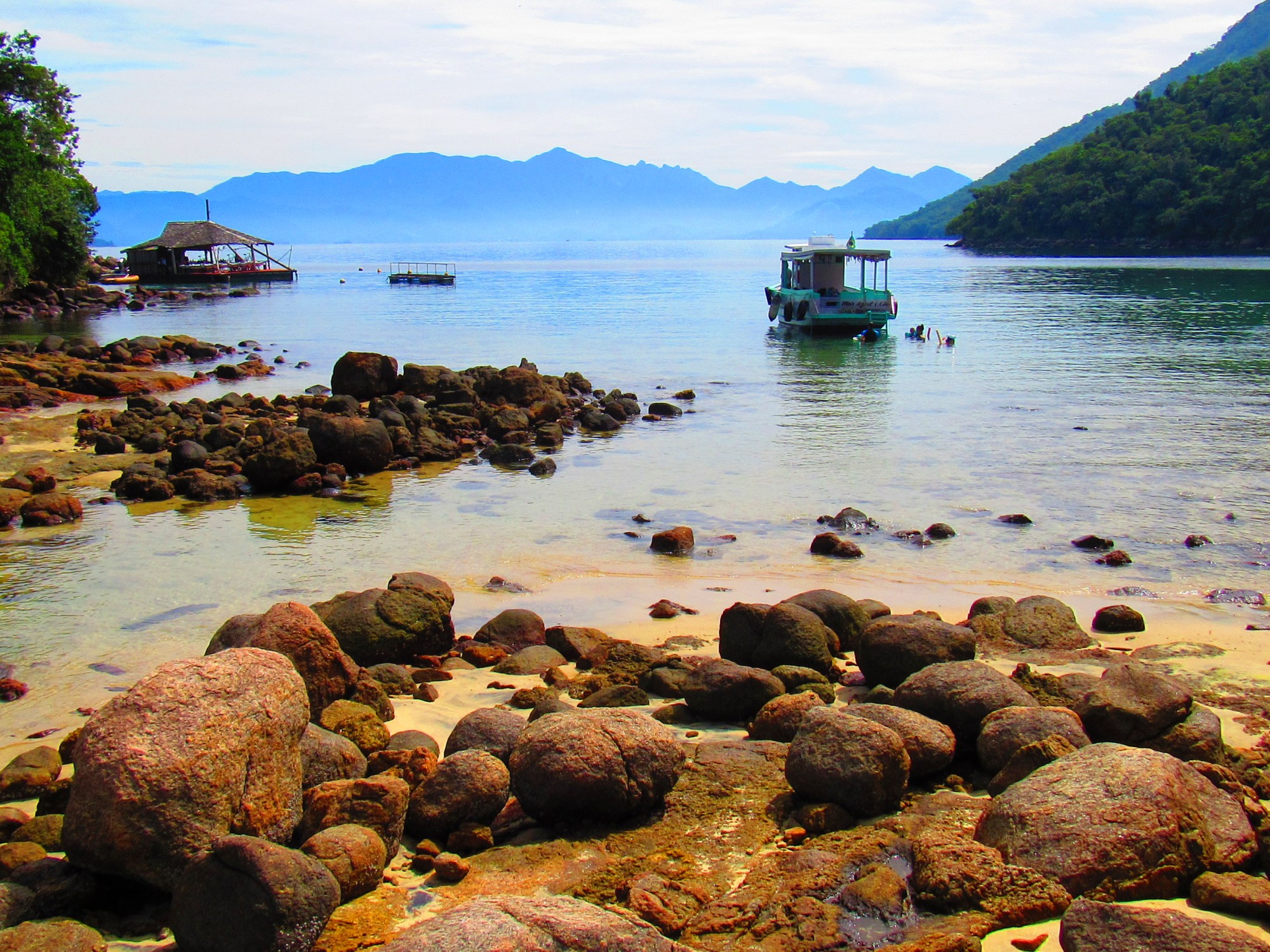 Chegamos em Angra dos Reis, deixamos o carro no estacionamento e pegamos o barco. Diferente da primeira vez que fomos, pegamos um tempo muito bom. Muito sol e calor. Chegamos, descarregamos as coisas e já fomos almoçar. Como sempre, a comida, excelente!