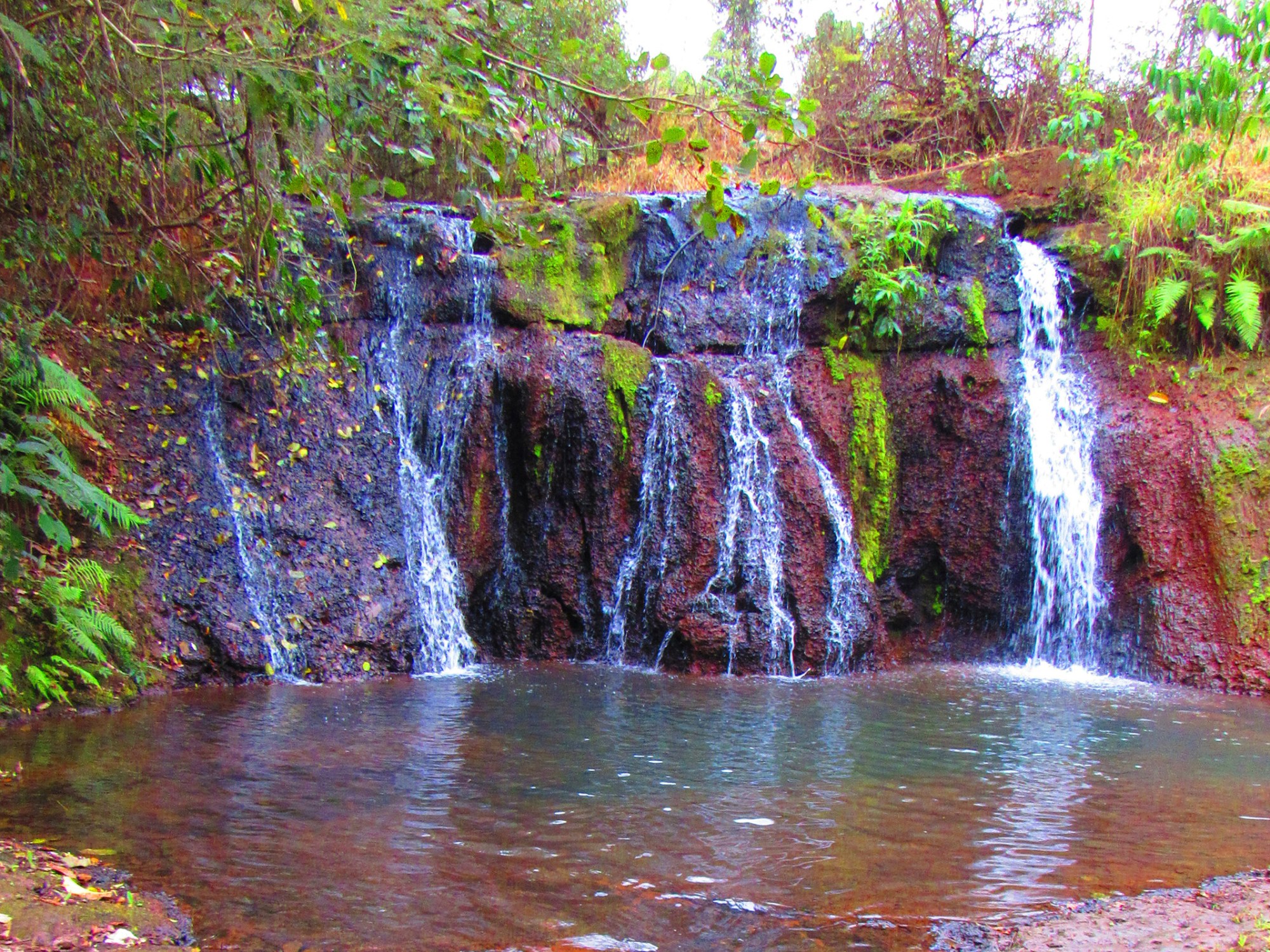 Paramos perto de uma mata e seguimos uma trilha bem marcada em meio a ela. Saímos no alto de uma cachoeira, que cai em um laguinho,e depois escorre para outro lago maior! Muito legal!