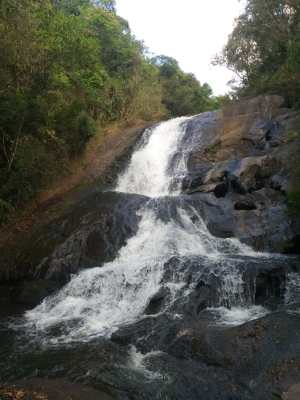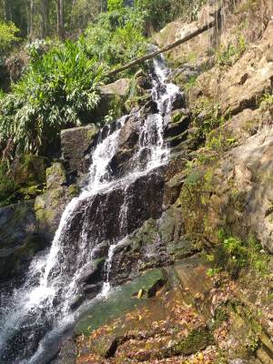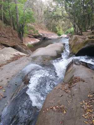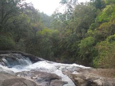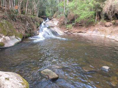A primeira queda, a água escorre pelas pedras, e também tem uns lugares bons para banho. O local é bem limpo e agradável.