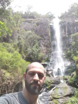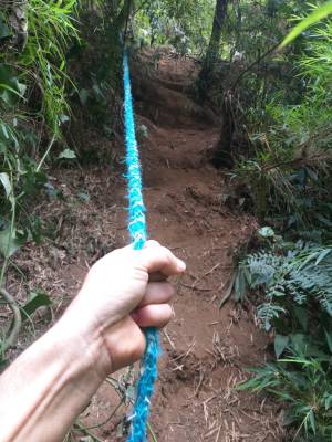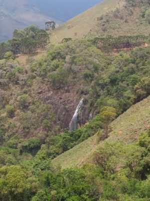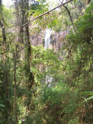 A cachoeira é tão alta que é possível avistá-la da estrada, bem de longe. Não contente, saí do carro, pulei a cerca e desci a pé aquele morro bem íngrime, na esperança de encontrar uma trilha até o pé da cachoeira. Queria ver ela de perto! Enfim, desci, deci e consegui achar uma trilhazinha. Aí a coisa ficou feia. Descendo por cordas, a trilha ficou quase vertical.