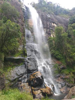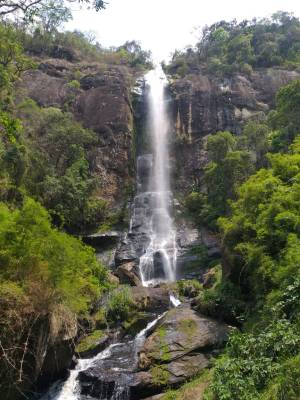 Lá de baixo, nem é possível ver a queda toda. Muito alta, absurdo! Também tem um lago legal no pé dela. A vista lá de baixo vale o sacrifício.