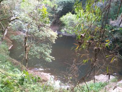 Descemos um pouco pela trilha, e chegamos na segunda queda. É também acessível na parte de cima, com uma vista bem bonita. Lá em baixo, um grande e fundo poço.