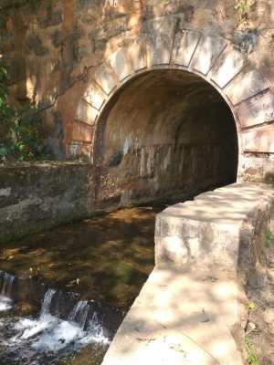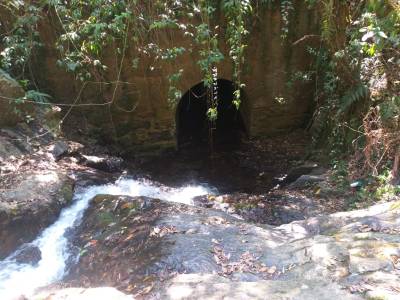 Continuamos por mais uns 8km, e chegamos na Cachoeira do Túnel. Do lado direito tem um lugar para estacionar o carro. Subimos por uma trilhazinha até a cachoeira, que é bem bonitinha, mas sem lago para nada. Até então não tínhamos entendido o porquê do nome “Cachoeira do Túnel”… Descemos um pouquinho o rio, e já descobrimos. O rio atravessa um túnel de pedra embaixo da estrada até o outro lado. Muito legal!