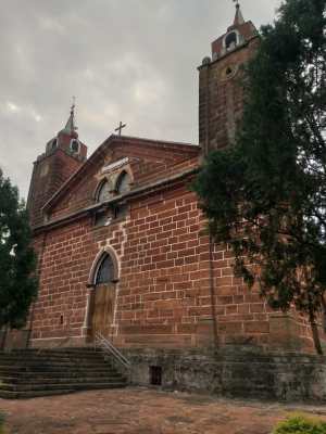 Beleza. Tirei umas fotos e segui a estradinha… peguei o asfalto e cheguei em Timburi. Enfim, como saio do serviço por volta das 17h não dá pra conhecer muita coisa, rs. Chegando lá, visitei a Paróquia Santa Cruz de Timburi, toda construida de blocos de arenito avermelhados… surpreendente!