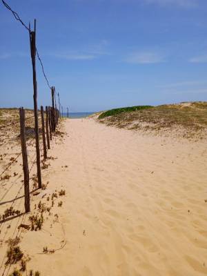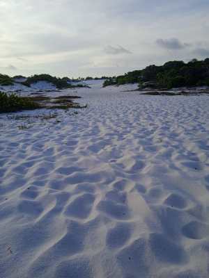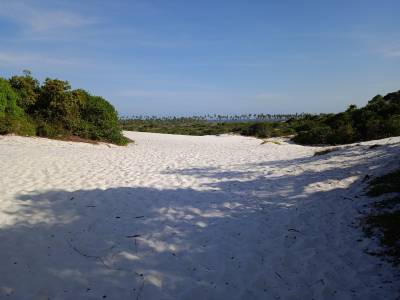 Voltamos para o camping, fizemos almoço e almoçamos. À tarde, quando o sol já tinha baixado, saímos a pé pela Vila de Diogo (onde fica o camping), e fomos até a praia pelas dunas. No começo a trilha é bem indicada, depois tem que ir meio na intuição. Vai seguindo as marcas de passos na areia, rs. Aliás, as dunas são lindas! Areia bem branquinha e a mata de restinga.