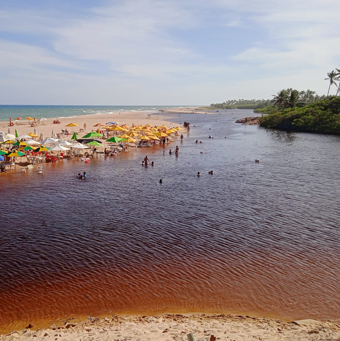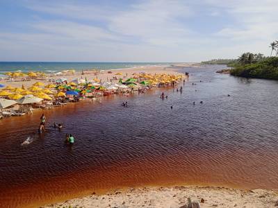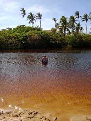 Seguimos mais 1h30, e chegamos em Imbassaí! Outro local que já tínhamos visitado, mas gostamos tanto que voltamos ali. Que praia top! Ninguém querendo olhar o carro, sem assédio a turistas, sem música alta nos quiosques… Água de rio e mar pertinho, tudo top! Ficamos a tarde toda lá!!!