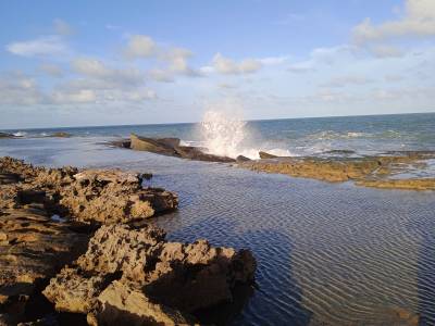 Seguimos um pouco, e taramos no camping em Tabatinga. Achamos estranho, pois na entrada do “camping” não havia nenhuma placa. Entramos e o proprietário nos recebeu. Vimos que o local era o quintal de uma casa, com apenas uma árvore. Como no dia seguinte seria Reveillon, resolvemos ficar. Até porque as pousadas locais estavam lotadas ou com preços absurdos. Saímos dar uma volta a pé. Fomos na praia, linda, com pedras e piscinas naturais.