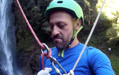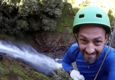 O guia fez as amarrações, colocamos a cadeirinha, capacete, e pouco a pouco as turma foi descendo. E chegou a minha vez! Aquele frio na barriga no começo, mas depois foi ótimo! O visual e a sensação foram incríveis. Lá no final me molhei um pouco, pois o rapel termina no lago da cachoeira.