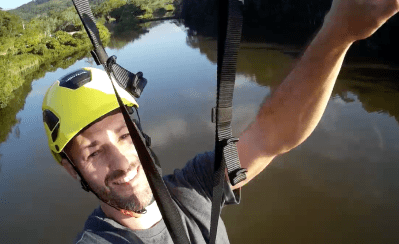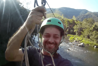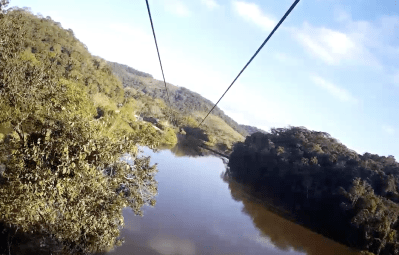 Depois do almoço, ainda na pousada, tivemos uma breve apresentação com produtores rurais locais, e em seguida pegamos a van novamente em direção à próxima tirolesa. Chegamos ao local, novamente guiado pela Águia Turismo, e essa tirolesa tem 300m de ida e mais 300m de volta, e cruza o Rio Pardo. Como o rio faz a divisa entre os estado de Paraná e São Paulo, atravessamos de um estado ao outro de tirolesa e voltamos. Muito legal, visual incrível!