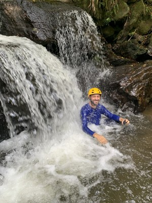 Voltamos pra pousada, almoço e fomos para a última atividade: Um Aquatrekking por um riozinho, afluente do Rio Turvo. Aquatrekking é uma caminhada realizada pelo leito de rios, molhando os pés, passando por obstáculos, pedra e pequenas quedas d’água. A atividade também foi realizada pela Explore Turismo (Júnior e Lívia). Saímos então, uma pequena trilha margeando o rio, e depois pelo leito do riacho, se apoiando entre as pedras, desviando de galhos, etc. Paramos em uma pequena cachoeira, tomamos um banho rápido, e seguimos por mais alguns metros até a cachoeira do final do percurso, a Cachoeira São Miguel. Linda, com três quedas d’água.