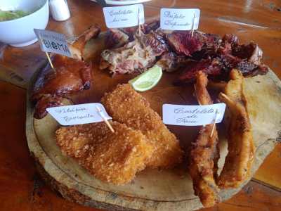 O almoço também foi sensacional. Arroz, farofa de pipoca, salada e 4 opções de carne (costelinha de pacu, tilápia crocante, carne de frango e búfalo defumados. Uma delícia!