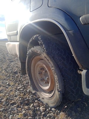 Passamos o trecho de rípio, começou de novo o asfalto, e adivinha… o pneu furou! Cara, em plena Patagônia, na Ruta 40 (que não passa quase ninguém), a 60km da cidade mais próxima, lá estávamos nós. Um pneu RASGADO (sim, porquê com o vento chacoalhando o carro, não percebemos que ele murchou e a roda cortou a borracha), e o outro pneu defeituoso que não estava segurando ar como estepe. Ótimo!