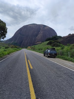 Partimos, em direção ao sul da Bahia. A estrada nesse ponto é particularmente bonita. Próximo à Nanuque-MG, pedras gigantes despontam, formando enormes morros. Paramos para tira umas fotos da Pedra da Boca.