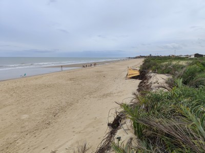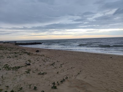 Saímos de viagem, rumo à Guriri. Muita estrada de terra, chuva e vento. Passamos por praias bonitas, mas não paramos por conta do tempo. Paramos em uma praia de Guriri, e depois fomos ao mercado repor as comidas. No caminho, passamos por Meleiras, paramos mais um pouco na Praia de Urussuquara.